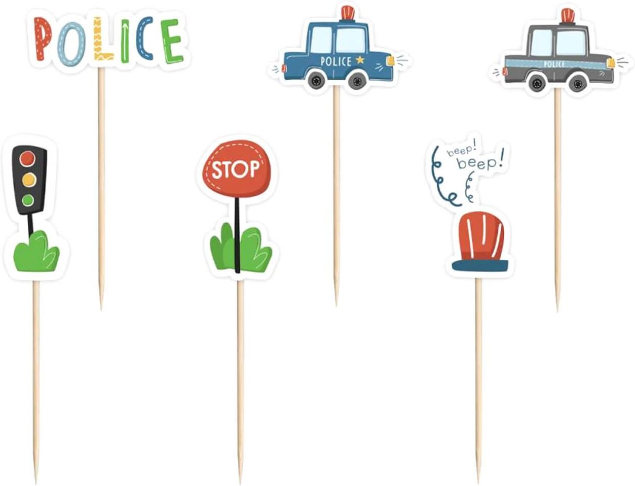 Papierowe dekoracje na piku w kształcie radiowozu, sygnalizacji świetlnej, znaku stop, sygnału policyjnego oraz napisem Police - Policja. Idealna dekoracja tortu lub muffinek na urodziny. Wysokość: 12,5 cm. Szerokość: 2,5 cm. Opakowanie: 6 szt.