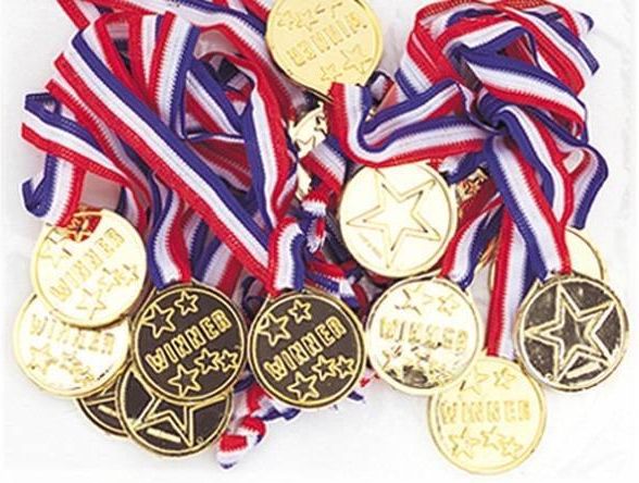 Plastikowy medal zwycięzcy mocowany na tasiemce. Wielkość: dł. tasiemki - 64 cm, śr. medalu - 3,5 cm. Opakowanie: 3 szt.