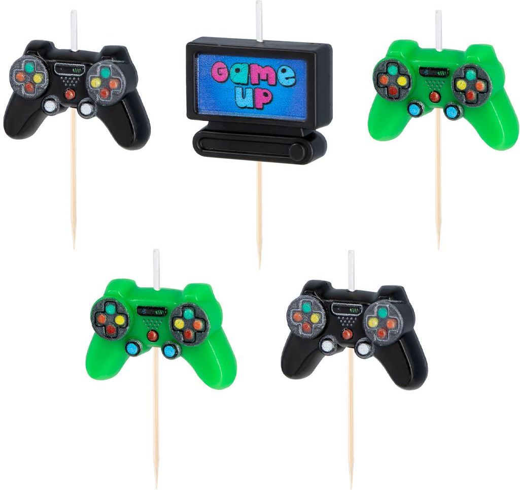 Świeczki pikery w kształcie kontrolerów do gry oraz konsoli. Idealna dekoracja tortu na urodziny dla fana gier komputerowych. Wysokość świeczek: 3,5 cm. Wysokość całkowita: 7 cm. Opakowanie: 5 szt.