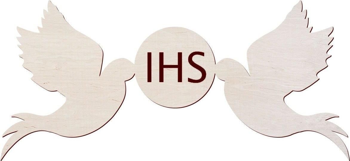 Drewniane scrapki konfetti - "gołąbki z hostią IHS". Świetnie nadają się do ozdabiania kartek oraz wielu innych przedmiotów do dekoracji na I Komunię Świętą. Materiał: sklejka. Kolor: naturalny. Wymiary: 5,5x2,5 cm. Opakowanie: 10 szt.