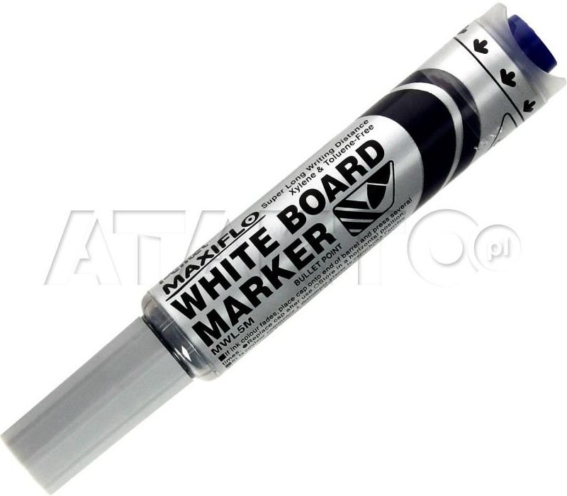 Niebieski, suchościeralny marker M do białych tablic z tłoczkiem firmy Pentel W tym markerze zastosowano już nie zwykły sączek, ale tusz dozowany jest za pomocą tłoczka, przez co linia pisania jest znacznie dłuższa aniżeli w innych markerach, zaś końcówka prezentowanego mazaka została znacznie …