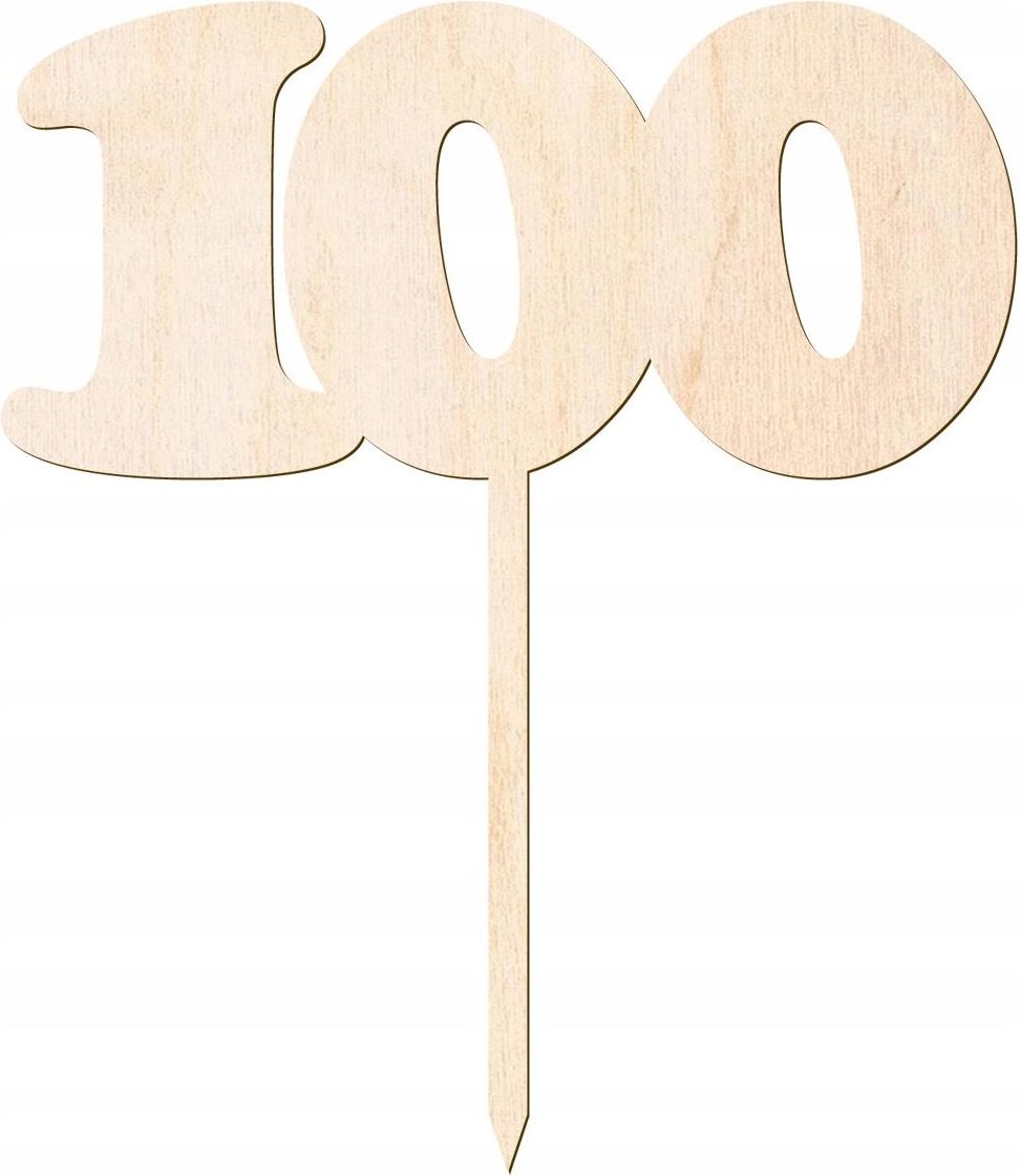 Toper z liczbą 100 - sto w kolorze naturalnym drewnianym, idealna dekoracja tortu na setne urodziny. Materiał: sklejka 3 mm. Wysokość: 12 cm. Opakowanie: 1 szt.