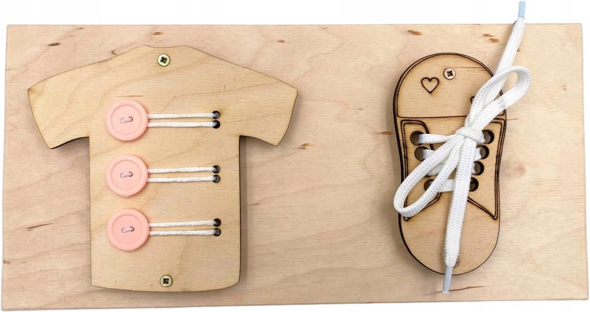 Nauka sznurowania i zapinania guzików. Wyposażenie: but ze sznurówką koszula z guzikami Zawiera samoprzylepny filc, zapobiegający rysowaniu podłoża