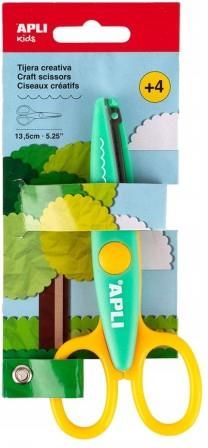 Para nożyczek szkolnych posiadających ostrze tnące w szlaczek ( fala ). Odpowiednie dla dzieci od 4 roku życia. Posiadają zaokrągloną końcówkę dla większego bezpieczeństwa, ergonomiczny uchwyt i są przeznaczone do użytku zarówno przez lewo i praworęcznych. Symetryczny uchwyt z tworzywa ABS i ostrza ze stali nierdzewnej zapewniają doskonała jakość i trwałość. Tną wszelkiego rodzaju materiały takie jak: papier, karton, gumę EVA, filc itp. Idealne do użytku w szkole jak i w domu Cechy nożyczek Apli Kids długość: 13,5 cm; materiał: stal nierdzewna, tworzywo sztuczne; ergonomiczne; do użytku oburęcznego; dla dzieci w wieku 4+