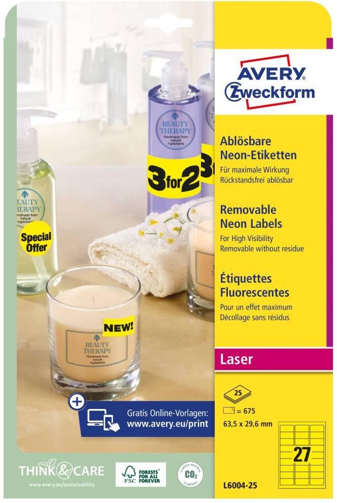 Etykiety neonowe - żółte 63,5 x 29,6 mm Usuwalne etykiety neonowe Etykiety w przyciągającej uwagę kolorystyce - odblaskowe kolory są bardzo wyraźnie widoczne, nawet z większej odległości. Etykiety neonowe są idealne do przekazywania ważnych i czasowych informacji, pozwalają uzyskać wyjątkową skuteczność w akcjach promocyjnych (można ich używać np. jako nalepki na opakowania produktów, naklejki informujące o zniżce lub wyprzedaży). Są łatwe do usunięcia lub przeklejenia w inne miejsce - nie pozostawiają śladów kleju. Po skończonej akcji promocyjnej lub informacyjnej można je szybko i sprawnie odkleić. Przeznaczone do zadruku w zwykłych, domowych drukarkach laserowych i kopiarkach. Darmowe i ławe w użyciu szablony oraz oprogramowanie do projektowania etykiet jest dostępne na stronie: www.avery-zweckform.pl CECHY PRODUKTU Wymiary: 63,5 x 29,6 mm Zawartość: Etykiety: 675 / Strona: 25 Rodzaj zadruku: Drukarki laserowe kolorowe, monochromatyczny laser, Kopiarka Rodzaj kleju: usuwalne Kolor: żółty neonowy