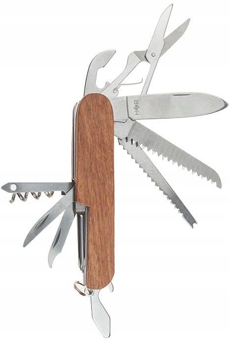 SCYZORYK KIESZONKOWY NÓŻ SKŁADANY MULTITOOL BSH Kieszonkowy scyzoryk to doskonałe wyposażenie ekwipunku prawdziwego mężczyzny. Doskonale przyda się zarówno na wszelkie wyprawy, jak i do codziennego użytku. Jego optymalne rozmiary pozwalają na schowanie go do w kieszeni, schowka samochodowego, plecaka, czy przymocowanie jako brelok do kluczy. Ostra głownia oraz pozostałe narzędzia zostały wykonane ze stali nierdzewnej 420. Ten wysokojakościowy materiał jest odporny na uszkodzenia oraz na korozję. Rękojeść została obłożona drewnianymi okładzinami. Ten niewielki nóż składany posiada aż 14 funkcjonalnych narzędzi, które przydadzą się w każdej okoliczności. Są to: nóż, piła, skrobak do ryb, nożyczki, otwieracz do butelek, otwieracz do puszek, korkociąg, rozwierak, śrubokręt krzyżakowy, pilnik, szydło. Nożyk nie posiada klasycznej blokady natomiast został wyposażony w łączenia typu slip joint, które utrzymują narzędzia w pozycji otwartej. Scyzoryk wielofunkcyjny posiada oczko do przewleczenia sznurka lub przymocowania jako breloczka. Doskonale sprawdzi się jako gadżet lub mały podarunek na każdą okazję. Scyzoryk posiada następujące funkcje Nóż Piła Skrobak do ryb Nożyczki Otwieracz do butelek Otwieracz do puszek Śrubokręt krzyżakowy Śrubokręt płaski Szpikulec/rozwierak Pilnik Szydło Korkociąg Przepychacz do haczyków Wybijak do skóry Scyzoryk posiada następujące funkcje Nóż Piła Skrobak do ryb Nożyczki Otwieracz do butelek Otwieracz do puszek Śrubokręt krzyżakowy Śrubokręt płaski Szpikulec/rozwierak Pilnik Szydło Korkociąg Przepychacz do haczyków Wybijak do skóry Dane techniczne Typ noża: składany Profil głowni: pen Typ ostrza: gładkie Długość po rozłożeniu: 180 mm Długość po złożeniu: 90 mm Szerokość po złożeniu: 25 mm Długość ostrza:55 mm Waga: 95 g Materiał narzędzi: stal nierdzewna 420 Materiał rękojeści: metal + drewno Sposób otwierania: nail nick Typ blokady: slip joint Ilość narzędzi: 14 Producent: BSH ADVENTURE