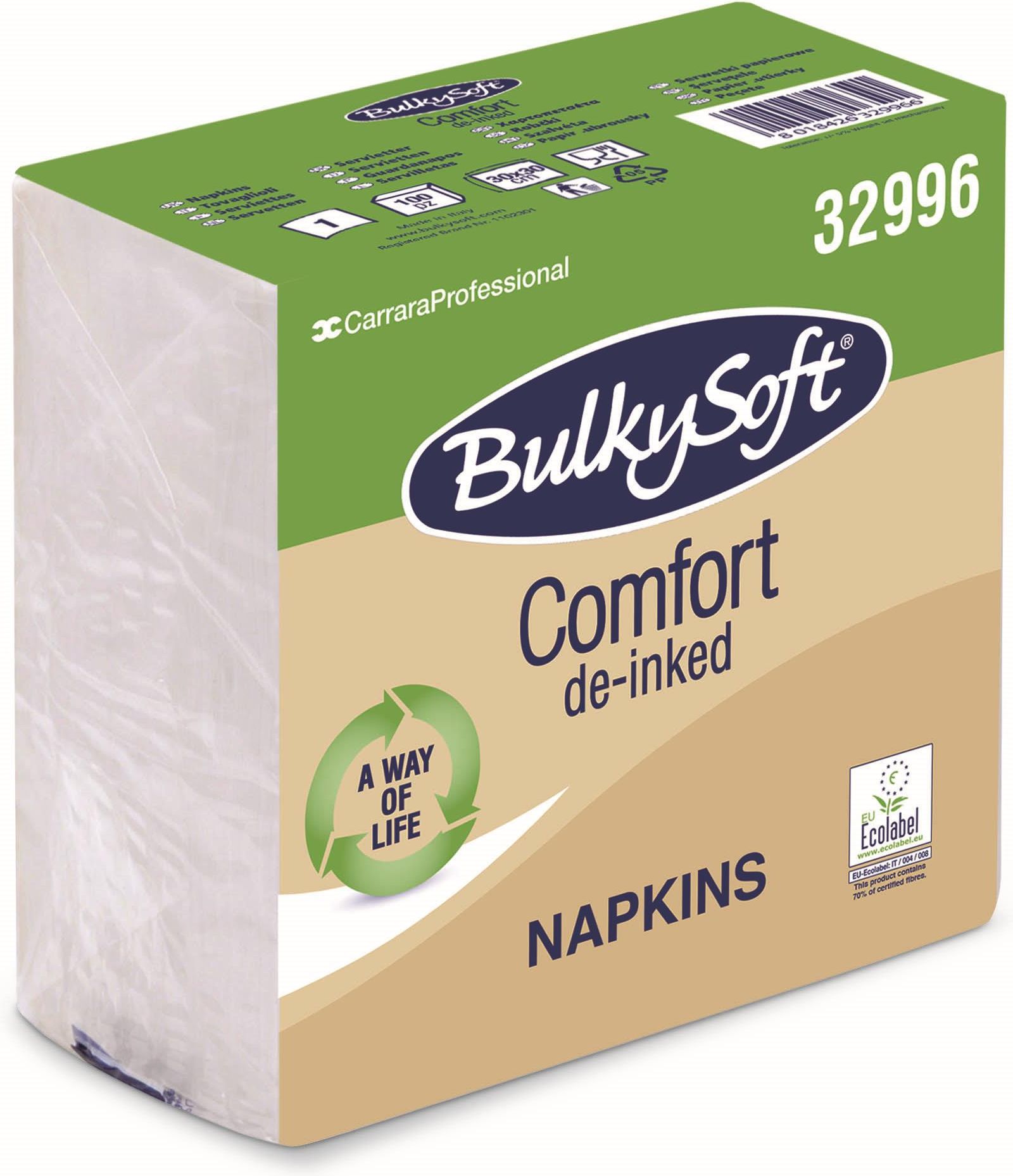Numer artykułu: 32966BULKYSOFT COMFORT De-inked serwetki 30x30 Składanie: 1/4Surowiec: Celuloza z celulozą z recyklinguKolor: 78% białościIlość warstw: 1Ilość w opakowaniu: 100Wymiary odcinka: 30x 30 cm Ilość opakowań w kartonie: 40opSerwetki papierowe jednowarstwowe Bulkysoft. Comfort de-inked, to produkt o wymiarach 30 x 30 cm, idealny do kawiarni, barów czy pubów. Wykonane są celulozy z dodatkiem celulozy z recyklingu. Polecany dla użytkowników, którym zależy na ekologii i ekonomiczności przy zachowaniu dobrej jakości. Jedno opakowanie zawiera 100 sztuk serwetek, a każda z nich jest elagancko gofrowana. Produkt ten jest miękki i miły w dotyku, wytrzymały na lekkie rozciąganie i pocieranie. Dobrze absorbuje wilgoć. Jednocześnie serwetki Bulkysoft są eleganckie i ładne. Dzięki swojemu estetycznemu wyglądowi mogą być stosowane w każdym miejscu.