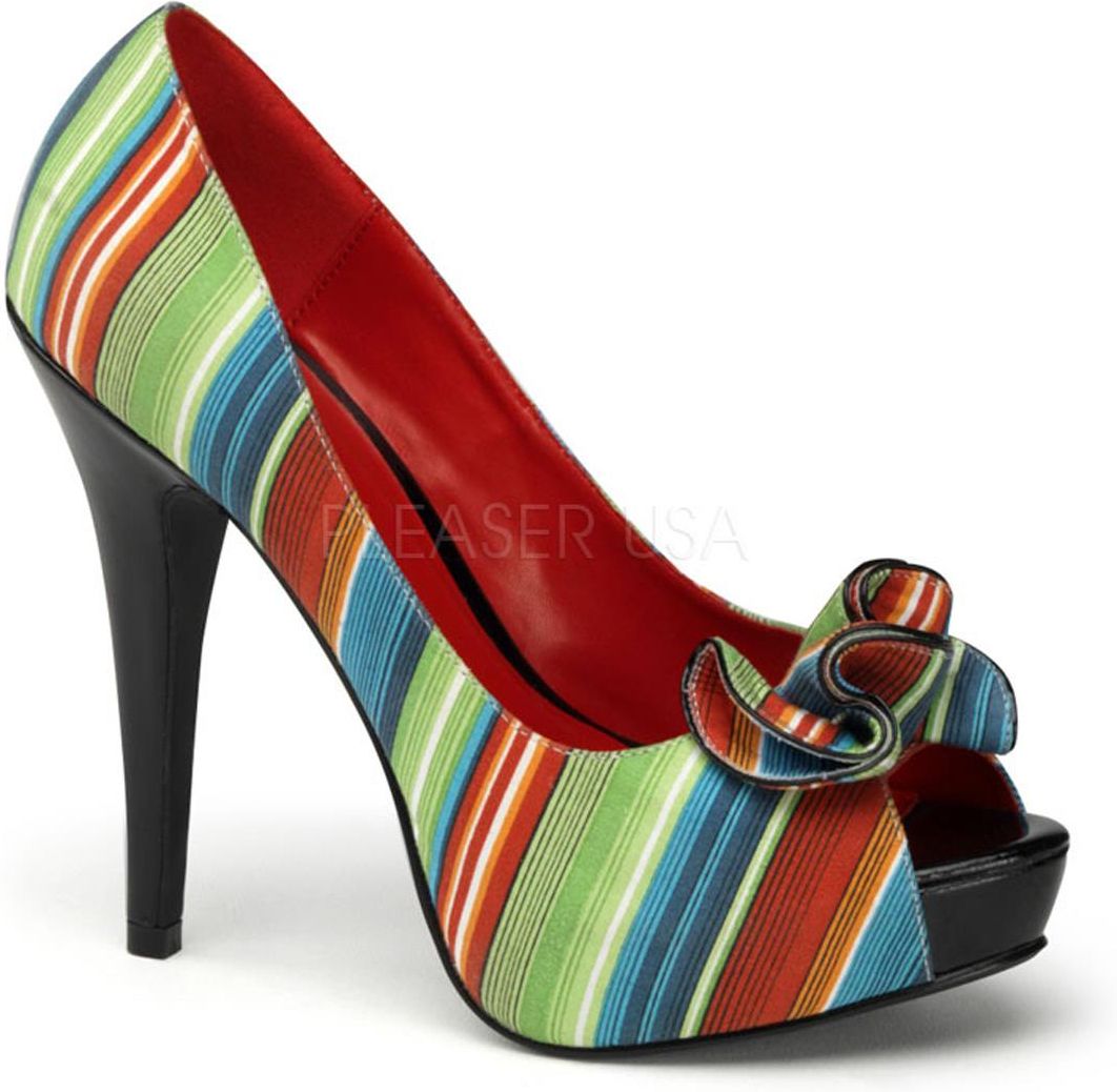 Zmysłowe i jednocześnie bardzo eleganckie szpilki damskie LOLITA-12 w kolorowe paski. Ten model obuwia został stworzony z wysokiej jakości materiałów. Dzięki temu szpilki mogą nosić także panie, które zrezygnowały z używania wyrobów ze skóry naturalnej. 12,7 centymetrowe obcasy optycznie wysmuklają sylwetkę. Odpowiednio wyprofilowana podeszwa gwarantuje komfort i stabilność w czasie chodzenia czy innych aktywności. Wycięcie na nosku odsłania kobiece palce, co prezentuje się niezwykle seksownie. Dodatkowo zapewnia odprowadzenie nadmiaru wilgoci ze stopy. Warto też zwrócić szczególną uwagę na element ozdobny w kształcie falbany, co sprawia, że ten model obuwia prezentuje się niezwykle elegancko. Czerwone szpilki LOLITA-12 spodobają się paniom, które cenią sobie klasyczny styl w nowoczesnym wydaniu. Buty będą idealnie pasować do bardzo wielu różnych stylizacji, zarówno casualowych, jak i bardziej formalnych.Buty LOLITA-12 dostępne są w rozmiarach od 35 do 41.