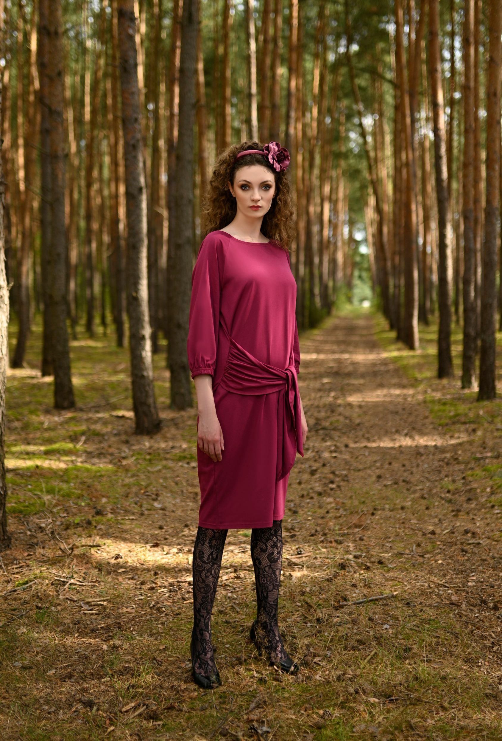 KOLOR: WIŚNIOWY Bawełna 94%, elastan 6%. Elastyczna dzianina bawełniana. GRAMATURA: 150 G/M2 Sukienka z rękawem 3/4, uszyta z miękkiej i przyjemnej w dotyku dzianiny. Prosty krój został wzbogacony elastycznym wiązaniem w pasie, które podkreśla talię i pozwala dopasować fason do sylwetki. Zaprojektowana i uszyta w Polsce. • elastyczne wiązanie w pasie, • rękaw 3/4 z lekkim bufowaniem, • długość midi, • modelka ma 177 cm wzrostu i nosi rozmiar M. Wymiary/