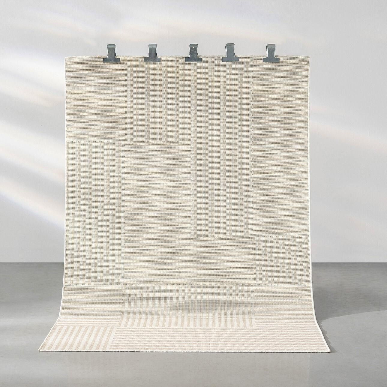 Dywan w beżowy geometryczny wzór wykonany z materiału z recyklingu.Nowoczesny dywan wykonany z przędzy RPET w jasnej, beżowej kolorystyce z geometrycznym układem pasów to funkcjonalny i estetyczny dodatek do współczesnych wnętrz.Dywan ma prostokątny kształt i wymiary 160x230 cm, dzięki czemu doskonale sprawdzi się w salonie, jadalni lub strefie wypoczynkowej. Utrzymany jest w neutralnych odcieniach beżu i ecru, z subtelnym, geometrycznym wzorem opartym na pasach o różnym kierunku ułożenia. Taka kompozycja nadaje całości nowoczesny, uporządkowany charakter, a jednocześnie pozostaje wizualnie lekka. Widoczny, płasko tkany splot podkreśla minimalistyczny styl dywanu i jego uniwersalność aranżacyjną.Wykonanie w 100% z RPET (poliestru z recyklingu) zapewnia trwałość, odporność na codzienne użytkowanie oraz łatwość pielęgnacji. Dywan jest antystatyczny i nadaje się do stosowania na ogrzewaniu podłogowym, co czyni go praktycznym wyborem do nowoczesnych domów i mieszkań. Model ten świetnie wpisuje się w aranżacje w stylu nowoczesnym, skandynawskim i minimalistycznym, dobrze komponując się z drewnianymi meblami, jasnymi tkaninami i prostymi dodatkami. Wymiary: szer. 160 cm, gł. 230 cm, wys. 1 cmMateriał: 100% RPETKolor: beżowyDodatkowe informacje: nadaje się do ogrzewania podłogowego