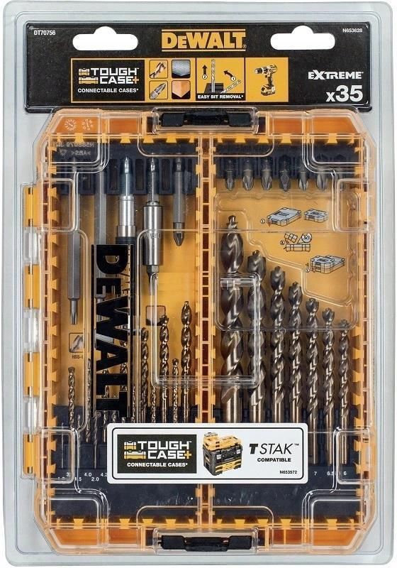 Zestaw mieszany DeWalt ToughCase+ /TSTAK - bity i wiertła metal/drewno EXTREME - 35 sztuk DeWalt Najważniejsze cechy produktu ToughCase+ /TSTAK - bity i wiertła metal/drewno EXTREME - 35 szt Największe zalety Zestaw 35 sztuk akcesoriów i wierteł HSS-G do metalu serii HSS-G EXTREME 2 DT70756 …