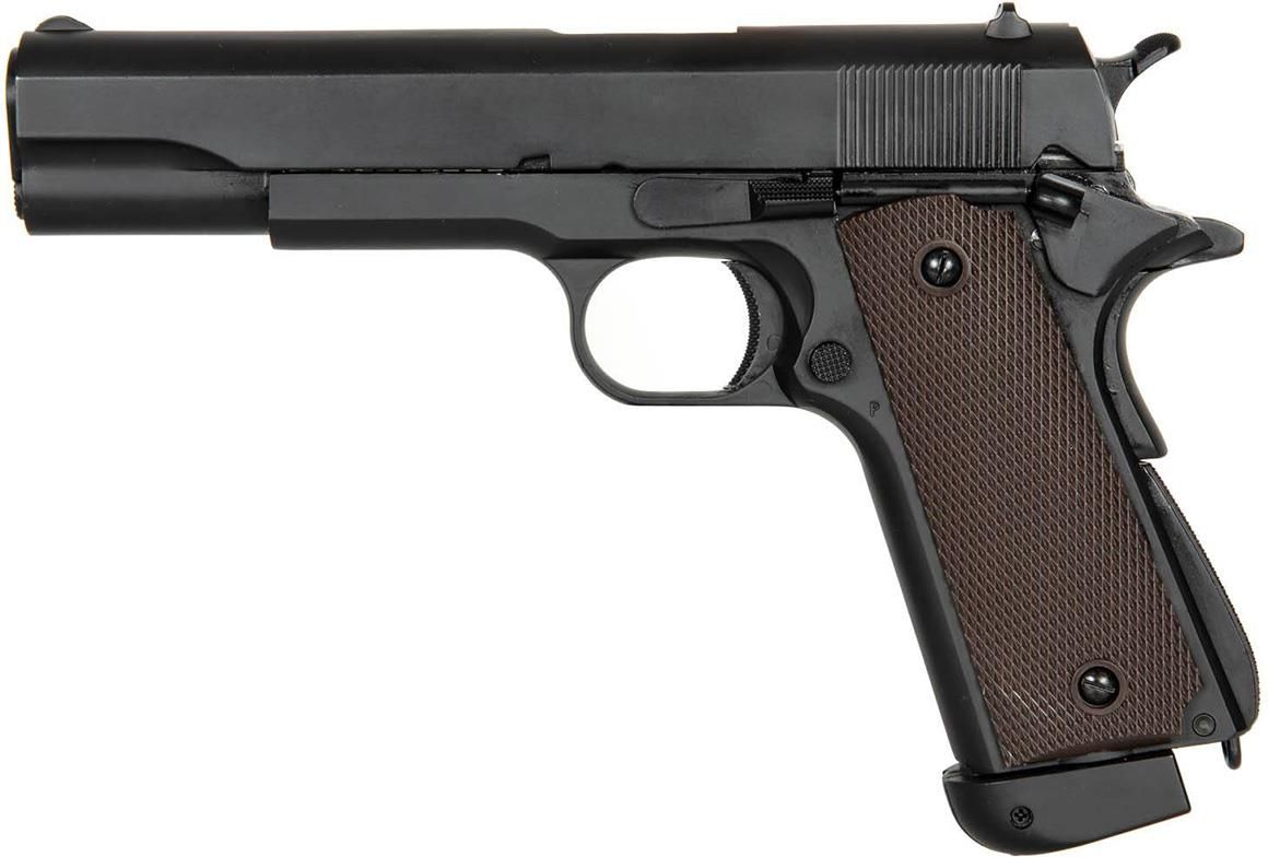Gazowa replika pistoletu M1911 wykonana niemal w całości z metalu , z tego materiału został wytworzony zarówno zamek, szkielet jak i magazynek. Tworzywo sztuczne zostało wykorzystane, tak jak w palnym pierwowzorze, wyłącznie do produkcji okładzin chwytu pistoletowego. W pistolecie zastosowano mechaniczne przyrządy celownicze, w postaci muszki i szczerbinki. Antypoślizgowa faktura chwytu pistoletowego sprawia, że replika pewnie leży w dłoni. Zastosowanie dwóch bezpieczników, skrzydełkowego i chwytowego , chroni użytkownika przed oddaniem niekontrolowanego strzału. Przeładowanie ułatwiają żłobienia na zamku zapewniające pewny chwyt. Dzięki systemowi Blow Back, każde ściągnięcie spustu powoduje odrzut zamka , który napina kurek, zaś jego ruch powrotny wprowadza kulkę do lufy. W sytuacji, w której w magazynku nie ma kulek, zamek pozostaje w tylnym położeniu. Jego zwolnienie możliwe jest po ściągnięciu dźwigni zrzutu zamka. Napędzana sprężonym dwutlenkiem węgla replika wystrzeliwuje kulki z prędkością rzędu 300 FPS . W dołączonym magazynku Low-cap, poza nabojem CO2 12 g, mieści się 25 kulek. Pistolet dostarczany jest w walizce transportowej z tworzywa sztucznego. W zestawie znajduje się: - replika, - magazynek, - zapasowy cylinder, - klucz imbusowy do montażu kapsuły. Dane techniczne Materiał: metal i tworzywo sztuczne Długość całkowita: 220 mm Waga: 920 g Kolor: czarny Napęd: CO2 12 g Prędkość początkowa: 300 FPS Hop-up: jest Blow back: jest Rodzaj magazynka: Low-cap Pojemność magazynka: 25 kulek Producent: Double Bell