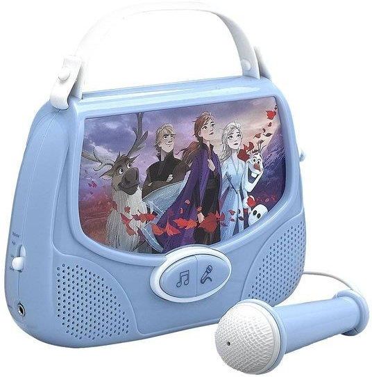 Zestaw karaoke w kształcie torebki z mikrofonem i głośnikiem. Idealny dla małych fanek Krainy Lodu – odtwarza muzykę i nagrywa głos. Stylowy i wygodny, łączy funkcjonalność z bajkowym designem!