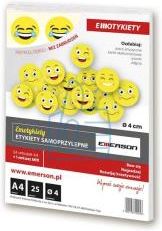 ETYKIETY EMERSON A4 ŚR.40 MM "EMOTKI"(25 Emerson * etykiety kolorowe firmy Emerson, to produkt z przeznaczeniem do tworzenia różnych promocji.* możliwość dowolnego zadruku na zwykłej drukarce biurowej.* sprzedawane na arkuszach A4 w opakowaniach po 25 szt., po 10 opakowań w kartonie