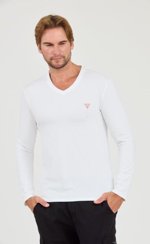Biały męski longsleeve Core Tee, marki Guess.Wymiary modela: wzrost: 190 cm, klatka: 107 cm, pas: 93 cm.Model ma na sobie produkt w rozmiarze: L.Wymiary produktu w rozmiarze L: szerokość pod pachami: 51,5 cm, długość całkowita: 68,5 cm.