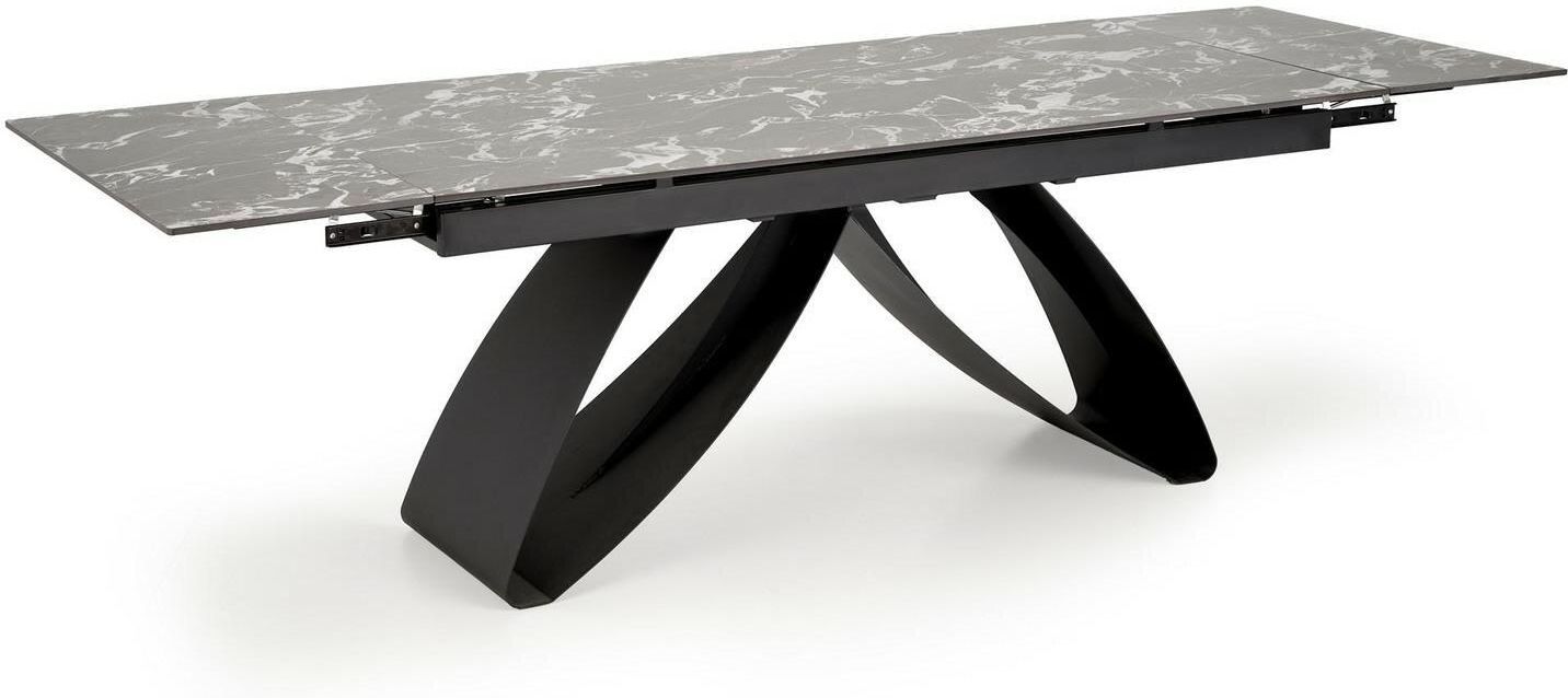 Stół rozkładany w industrialnym stylu! Stół rozkładany Margareth w kolorze czarnym to prawdziwe dzieło sztuki, które wnosi do wnętrza niepowtarzalny, designerski charakter. Jego wyjątkowy wygląd z czarnym marmurowym blatem i stalową nogą w głębokim odcieniu czerni sprawia, że stół staje się centralnym punktem każdego pomieszczenia. Stalowa noga nie tylko dodaje nowoczesności, ale również solidności, co sprawia, że stół jest zarówno elegancki, jak i funkcjonalny. Każdy element stołu został starannie zaprojektowany, aby zapewnić najwyższą jakość i estetykę, co czyni go idealnym wyborem dla osób ceniących sobie luksus i wyrafinowanie w swoim wnętrzu. Funkcjonalność stołu Margareth jest równie imponująca jak jego wygląd. Stół posiada rozkładany blat, który można zwiększyć z 180 cm do 260 cm, co umożliwia elastyczne dostosowanie stołu do różnych potrzeb. Dzięki prostemu i niezawodnemu mechanizmowi rozkładania, zmiana rozmiaru stołu jest szybka i łatwa, co jest niezwykle praktyczne w codziennym użytkowaniu, jak i podczas większych przyjęć czy rodzinnych spotkań. Solidna konstrukcja zapewnia stabilność i bezpieczeństwo, nawet przy większych obciążeniach, co czyni stół nie tylko pięknym, ale również praktycznym meblem. Trwałość i łatwość w utrzymaniu to kolejne atuty stołu Margareth. Wykorzystanie wysokiej jakości spieku i stali malowanej proszkowo sprawia, że stół jest odporny na uszkodzenia i długowieczny. Spiek marmurowy, z którego wykonano blat, jest materiałem łatwym w utrzymaniu czystości i odpornym na plamy oraz zarysowania, co ułatwia dbanie o jego wygląd. Gładka powierzchnia blatu oraz stalowe nogi pozwalają na szybkie i łatwe czyszczenie, co jest praktyczne w codziennej pielęgnacji. Dzięki tym cechom stół Margareth jest idealnym wyborem dla osób, które szukają eleganckiego, funkcjonalnego i trwałego mebla do swojego wnętrza. Co musisz wiedzieć przed zakupem? Czarny marmurowy blat w połączeniu z czarną stalową nogą tworzy wyjątkowo elegancki i luksusowy wygląd Możliwość rozłożenia blatu od 180 cm do 260 cm umożliwia elastyczne dostosowanie stołu do różnych potrzeb Wykorzystanie wysokiej jakości spieku i stali malowanej proszkowo zapewnia trwałość i odporność na uszkodzenia