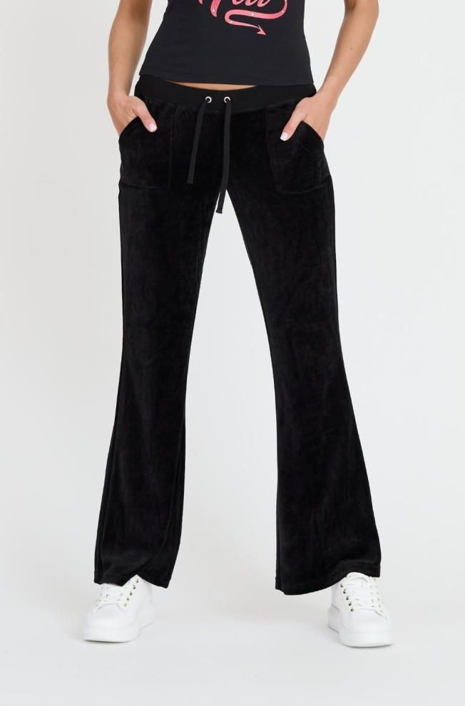 Czarne damskie spodnie Caisa Ultra Low Rise, marki Juicy Couture.Wymiary modelki: wzrost 176 cm, biust 85 cm, talia 65 cm, biodra 92 cm.Modelka ma na sobie produkt w rozmiarze S.Wymiary produktu w rozmiarze S: szerokość w pasie: 38 cm, długość nogawki od zewnątrz: 103,5 cm, długość nogawki od wewnątrz: 82,5 cm.