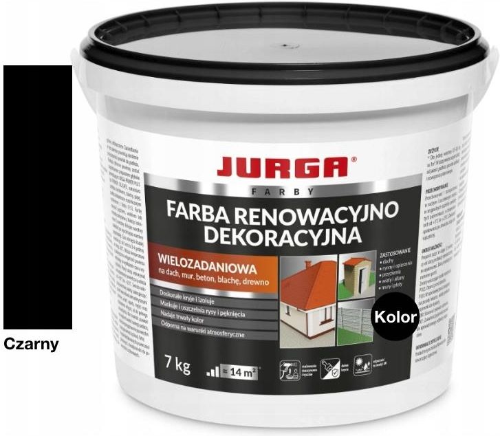 JURGA PAPA W PŁYNIE CZARNA Pojemność: 7KG Kolor: CZARNY Postać: Gęsta tiksotropowa masa Zużycie: dla jednej warstwy 0,4-0,8 kg na 1m² Mycie narzędzi: Woda Produkt o właściwościach dekoracyjno-ochronnych, przeznaczony do renowacji powierzchni takich jak mury, przyziemia ścian zewnętrznych budynku, dachy, opierzenia,elementy architektury ogrodowej: altany, domki i skrzyniena narzędzia, wiaty itp. Właściwości i zastosowanie .Posiada doskonałą przyczepność doróżnych powierzchni, w tym: beton, tynk, papę, blachętrapezową, eternit, blachodachówkę, dachówkęcementową i ceramiczną, powłoki bitumiczne, drewno,blachę ocynkowaną, gazony. Farba posiada bardzo dobrewłaściwości kryjące, wysoką elastyczność oraz powyschnięciu tworzy powłokę odporną na działanie wody,mrozu, UV. Produkt jest łatwy w aplikacji, szybkoschnący,nie zawiera rozpuszczalników Dane techniczne Baza chemiczna: Dyspersja akrylowa, wypełniacze, dodatki uszlachetniające Postać: Gęsta tiksotropowa masa Gęstość: Ok 1,36 g /cm³ Zużycie dla 1 warstwy: 0,4-0,8 kg na 1m² Mycie narzędzi: Woda Aplikacja: pędzel, wałek, natrysk (dysza Ø min. 3mm, zalecane ciśnienie 5 bar) Ilość warstw: min. 2 Zużycie Dla jednej warstwy 0,4-0,8 kg na 1m². W dużej mierzezużycie zależy od jakości podłoża, sposobu aplikacji irozwiązania systemowego.W celu uzyskania jednolitego koloru, produkty z różnychpartii produkcyjnych należy wymieszać ze sobą przedużyciem. Przygotowanie podłoża Podłoże Przed użyciem produkt należy dobrze wymieszać,nie rozcieńczać. Podłoże przeznaczone do malowania powinno być wysezonowane, suche, czyste, mocne, stabilne, wyrównane, odpylone, odtłuszczone. Zaniedbania w tym zakresie powodują obniżenie przyczepności powłokido podłoża. Podłoża chłonne powinny zostać zagruntowane preparatem głęboko penetrującym JURGA PRIMER PLUS lub PRIMER SILICATE, natomiast podłoża niechłonne, blachy, papy, podłoża bitumiczne rozcieńczonym roztworem z farby(1:5). Bezpośrednio przed użyciem całą zawartość opakowania należy bardzo dokładnie wymieszać aż douzyskania jednolitej konsystencji. Farbę nanosić pędzlem wałkiem lub metodą natryskową ( dysza Ø min. 3mm,zalecane ciśnienie 5 bar) . Nałożyć minimum 2 warstwy. Kolejne warstwy nakładać po wyschnięciu warstwy poprzedniej. Dla powłoki, która ma spełniać właściwości uszczelniające grubość ostateczna powinna wynosić nagotowo min. 1mm. Czas schnięcia każdej warstwy to średnio 2-3 godziny w temp. 20°C (pyłosuchość). Pełne utwardzenie gotowej powłoki – 12-24h (w zależności od warunkówzewnętrznych). Niższa temperatura i podwyższona wilgotność powierza wpływają na wydłużenie czasu wysychania. Pracę należy wykonywać w temperaturze powietrza i podłoża od +10°C do +25°C. Świeżo nałożoną warstwę należy zabezpieczyć przed warunkami atmosferycznymi (słońce, wiatr, opady, mgły) orazdziałaniem wilgoci, aż do pełnego utwardzenia. Na trwałość powłoki ma wpływ trwałość samego podłoża, właściwe przygotowanie powierzchni oraz poprawność aplikacji farby. Produkt dedykowany do powierzchni nieużytkowanych. Sposób użycia Każdorazowo przed użyciem intensywnie wstrząsnąć puszką (przez min. 30 sek.) w celu dokładnego wymieszania składników. Nie rozcieńczać. Powierzchnia przeznaczona do czyszczenia powinna być sucha. Preparat należy wylać na całą powierzchnię zabrudzenia bezpośrednio po wymieszaniu produktu w puszce. Odczekać kilka minut, do uzyskania białego nalotu. Następnie usunąć biały osad „na sucho” używając szczotki lub szorstkiej gąbki. Po wyczyszczeniu obficie spłukać wodą, najlepiej ciepłą, używając jednocześnie szczotki do sczyszczenia pozostałości osadu. Pozostawić do wyschnięcia. W przypadku bardzo silnych zabrudzeń, zaleca się powtórzenie czynności czyszczących. Stosować środki ochrony osobistej. Temperatura podłoża i otoczenia podczas czyszczenia powinna wynosić od +10°C do +25°C. Unikać czyszczenia na nagrzanych podłożach i podczas wiatru. W przypadku gdy plama dodatkowo zabrudzona jest zanieczyszczeniami mineralnymi użyć do ich usunięcia produktu Jurga Cleaner HD. Po wyschnięciu wyczyszczoną powierzchnię zaleca się zabezpieczyć produktem JURGA z serii PROTECT lub PROOF. Zalecenia bezpieczeństwa Chronić przed dziećmi. Podczas pracy należy przestrzegać przepisów BHP, nosić środki ochrony osobistej (rękawiczki gumowe, okulary, ubranie robocze) Unikać zanieczyszczenia skóry i oczu. W przypadku dostania się go do oczu, należy niezwłocznie przemyć dużą ilością czystej wody i w razie potrzeby skontaktować się z lekarzem.