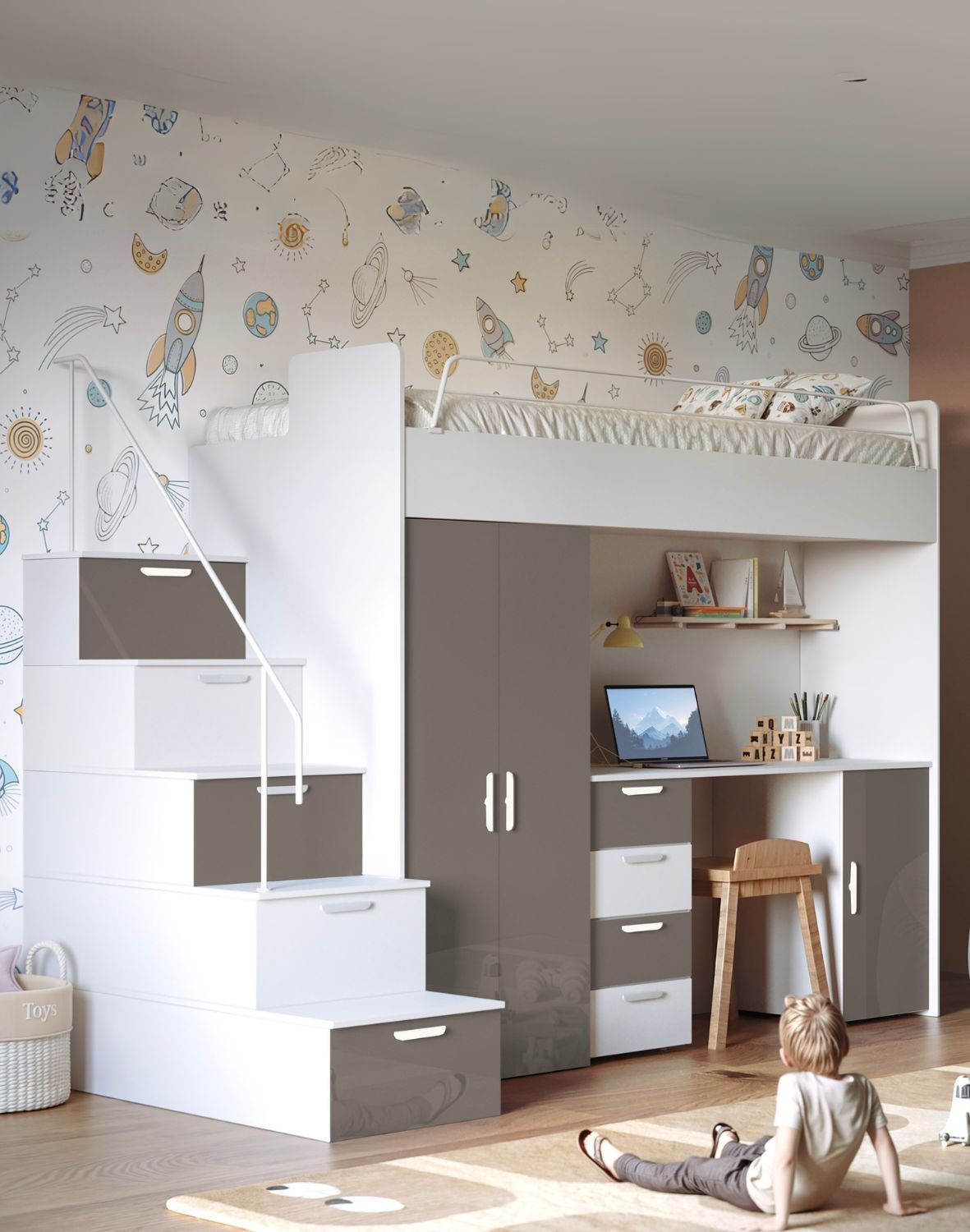 Meblościanka Raj 4 to kompleksowy system meblowy typu "wszystko w jednym", stworzony z myślą o maksymalnym wykorzystaniu przestrzeni w pokoju dziecięcym lub młodzieżowym.Funkcjonalne rozwiązania, przemyślany układ i nowoczesna forma sprawiają, że jest to idealna propozycja do mniejszych wnętrz.System zawiera:- łóżko piętrowe (na górze) ze stelażem i materacem,- biurko z szufladami i szafką (w centralnej części),- pojemną szafę ubraniową,- praktyczne schody z szufladami w stopniachObciążenie górnego łóżka wynosi do 75 kg.Fronty zestawu są wykonane z płyty meblowej MDF połysk.Korpus łóżka jest wykonany z odpornej na zarysowania płyty laminowanej w kolorze białym o grubości 16 mm.Łóżko może być złożone w wersji ze schodkami z prawej lub z lewej strony (podczas montażu samemu decyduje się z której strony ma być wejście na łóżko).Szuflady biurka można zamontować po lewej lub prawej stronie.Stelaż łóżka jest wykonany z ramy ze sklejki bukowej dzięki czemu jest on bardzo wytrzymały. Stelaż posiada 21 listew sprężynujących.Uchwyty wykonane są z tworzywa PCV.To wszystko w jednym spójnym zestawie, który pozwala urządzić cały pokój w sposób funkcjonalny i estetyczny.Raj 4 dostępny jest w 8 modnych wariantach kolorystycznych, szafki są wykończone na wysoki połysk:- biały + fiolet- biały + biały- biały + beż- biały + czarny - biały + szary- biały + niebieski- biały + róż- biały + zielonyKorpus w uniwersalnej bieli harmonijnie łączy się z barwnymi frontami, nadając meblom świeżość i styl.Model objęty jest 2 letnią gwarancją producenta.Produkt dostarczymy do Państwa BEZPŁATNIE pod wskazany adres na terenie całego kraju.Mebel wymaga samodzielnego montażu, zgodnie z załączoną instrukcją.Co WAŻNE: zgodnie z prawem i naszymregulaminemmają Państwo pełne prawo do zwrotu nieużywanych towarów, jeśli nie spełnią one Państwa oczekiwań. Wymiary: