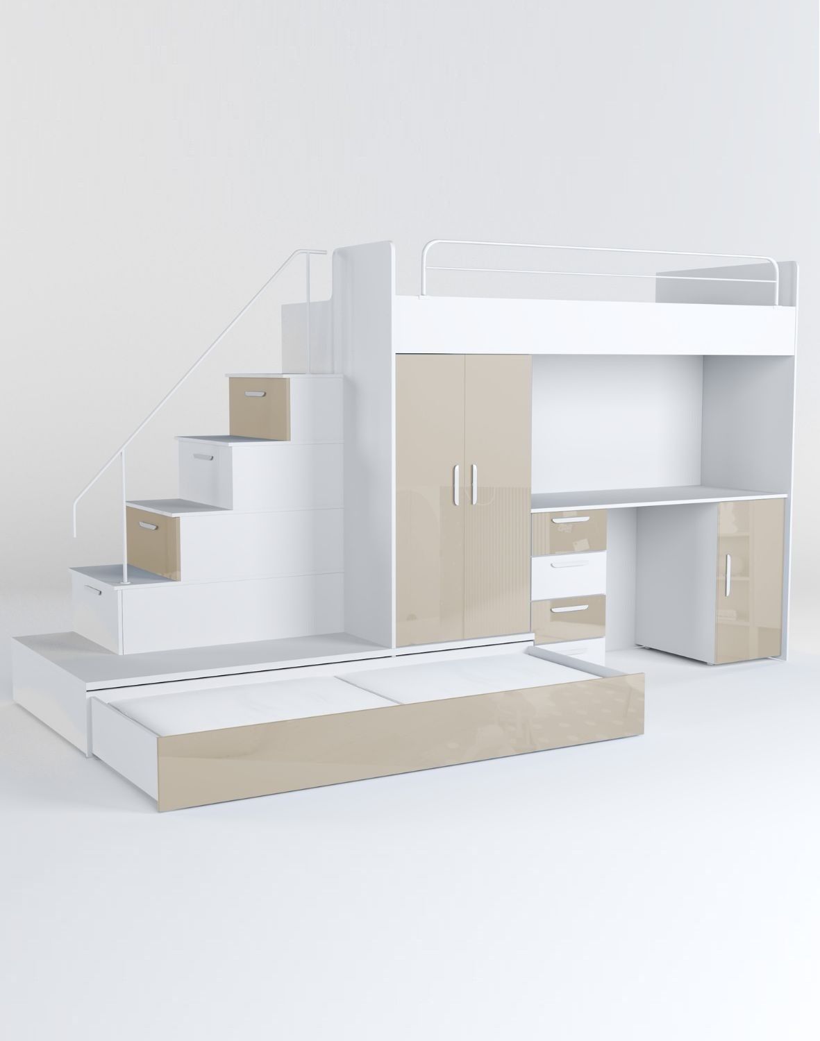 Zestaw Raj 5 to kompleksowe rozwiązanie do pokoju dziecka lub nastolatka.Łączy wygodne miejsce do spania, praktyczne biurko, pojemną szafę oraz bezpieczne schodki z funkcją przechowywania, dodatkowo posiada wygodne siedzisko oraz wysuwany materac.To nie tylko oszczędność miejsca, ale i maksymalne wykorzystanie przestrzeni w atrakcyjnej formie.W skład zestawu wchodzą:- łóżko piętrowe (na górze) ze stelażem i materacem,- biurko z szufladami i szafką (w centralnej części),- pojemną szafę ubraniową,- praktyczne schody z szufladami w stopniach – z możliwością montażu po lewej lub prawej stronie,- wygodne siedzisko,- wysuwane dodatkowe miejsce do spania - rozkładany materac piankowy w dolnej szufladzie ( 75 cm x 180 cm) o grubości 7 cm.Cechy i zalety:- Bezpieczeństwo – barierki na górnym łóżku i przy schodkach.- Wysoka jakość – solidna płyta laminowana i fronty MDF na wysoki połysk.- Modny design – nowoczesne wykończenie w atrakcyjnych kolorach.- Praktyczność – biurko, szafa i schodki z funkcją przechowywania w jednym meblu.- Udźwig górnego łóżka: do 75 kg.- Stelaż łóżka jest wykonany z ramy ze sklejki bukowej dzięki czemu jest on bardzo wytrzymały. Stelaż posiada 21 listew sprężynujących. Raj 5 dostępny jest w 8 modnych wariantach kolorystycznych, szafki są wykończone na wysoki połysk:- biały + fiolet- biały + biały- biały + beż- biały + czarny - biały + szary- biały + niebieski- biały + róż- biały + zielony To doskonały wybór dla chłopca i dziewczynki – praktyczny, nowoczesny i bezpieczny zestaw, który odmieni każdy pokój dziecięcy lub młodzieżowy.Model objęty jest 2 letnią gwarancją producenta.Produkt dostarczymy do Państwa BEZPŁATNIE pod wskazany adres na terenie całego kraju.Mebel wymaga samodzielnego montażu, zgodnie z załączoną instrukcją.Co WAŻNE: zgodnie z prawem i naszymregulaminemmają Państwo pełne prawo do zwrotu nieużywanych towarów, jeśli nie spełnią one Państwa oczekiwań. Wymiary: