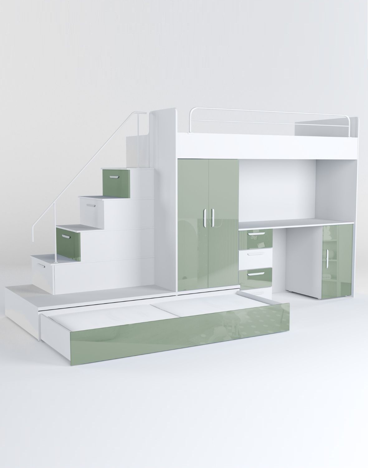 Zestaw Raj 5 to kompleksowe rozwiązanie do pokoju dziecka lub nastolatka.Łączy wygodne miejsce do spania, praktyczne biurko, pojemną szafę oraz bezpieczne schodki z funkcją przechowywania, dodatkowo posiada wygodne siedzisko oraz wysuwany materac.To nie tylko oszczędność miejsca, ale i maksymalne wykorzystanie przestrzeni w atrakcyjnej formie.W skład zestawu wchodzą:- łóżko piętrowe (na górze) ze stelażem i materacem,- biurko z szufladami i szafką (w centralnej części),- pojemną szafę ubraniową,- praktyczne schody z szufladami w stopniach – z możliwością montażu po lewej lub prawej stronie,- wygodne siedzisko,- wysuwane dodatkowe miejsce do spania - rozkładany materac piankowy w dolnej szufladzie ( 75 cm x 180 cm) o grubości 7 cm.Cechy i zalety:- Bezpieczeństwo – barierki na górnym łóżku i przy schodkach.- Wysoka jakość – solidna płyta laminowana i fronty MDF na wysoki połysk.- Modny design – nowoczesne wykończenie w atrakcyjnych kolorach.- Praktyczność – biurko, szafa i schodki z funkcją przechowywania w jednym meblu.- Udźwig górnego łóżka: do 75 kg.- Stelaż łóżka jest wykonany z ramy ze sklejki bukowej dzięki czemu jest on bardzo wytrzymały. Stelaż posiada 21 listew sprężynujących. Raj 5 dostępny jest w 8 modnych wariantach kolorystycznych, szafki są wykończone na wysoki połysk:- biały + fiolet- biały + biały- biały + beż- biały + czarny - biały + szary- biały + niebieski- biały + róż- biały + zielony To doskonały wybór dla chłopca i dziewczynki – praktyczny, nowoczesny i bezpieczny zestaw, który odmieni każdy pokój dziecięcy lub młodzieżowy.Model objęty jest 2 letnią gwarancją producenta.Produkt dostarczymy do Państwa BEZPŁATNIE pod wskazany adres na terenie całego kraju.Mebel wymaga samodzielnego montażu, zgodnie z załączoną instrukcją.Co WAŻNE: zgodnie z prawem i naszymregulaminemmają Państwo pełne prawo do zwrotu nieużywanych towarów, jeśli nie spełnią one Państwa oczekiwań. Wymiary: