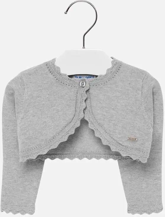 Sweter z włóczki z delikatnym połyskiem to piękny i praktyczny dodatek do sukienek. Sweterek trykotowy Zapięcie na jeden guzik sweterek modnej dziecięcej marki Mayoral materiał: 80% bawełna, 17% poliester, 3% elastan szary elegancki kolor długość całkowita 19 cm, 28 cm od pachy do pachy. 30 cm długość rękawa.
