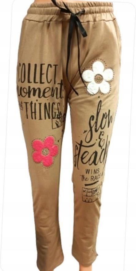 Spodnie DRESOWE damskie wiosenne w kwiaty elastyczne brązowe modne Brwinów