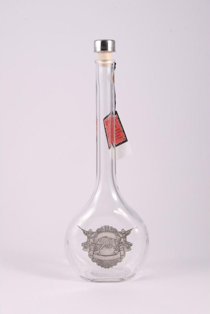 Ładna, o oryginalnym design szklana karafka 500ml ze zdobieniami(tarcza z dzikiem i myśliwymi po bokach) na szkle wykonanymi cyną, firmowana marką Freitas & Dores Unipessoal Freitas & Dores Unipessoal, Lda jest portugalską firmą założoną w 1983 roku i specjalizującą się w produkcji artykułów do …