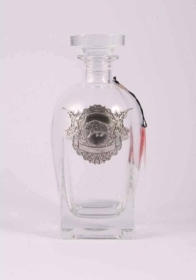 Ładna, o oryginalnym design szklana karafka 700ml ze zdobieniami(tarcza z dzikiem i myśliwymi po bokach) na szkle wykonanymi cyną, firmowana marką Freitas & Dores Unipessoal Freitas & Dores Unipessoal, Lda jest portugalską firmą założoną w 1983 roku i specjalizującą się w produkcji artykułów do dekoracji wnętrz z dodatkiem i zdobieniami z cyny, zlokalizowaną w Maia, znajdującym się nieopodal Porto. Wszystkie produkty wykonane są w 95% z czystej cyny i w 5% z miedzi i antymonu oraz zgodnie z regułą europejską - EN 611. Produkty Freitas & Dores cechuje ekskluzywność i kreatywność, a każdy przedmiot jest efektem skrupulatnej pracy i całkowitego poświęcenia 20 osób/rzemieślników firmy specjalizujących się w tworzeniu oraz dekorowaniu przedmiotów cyną, ale przy pomocy znanych i cenionych portugalskich projektantów.