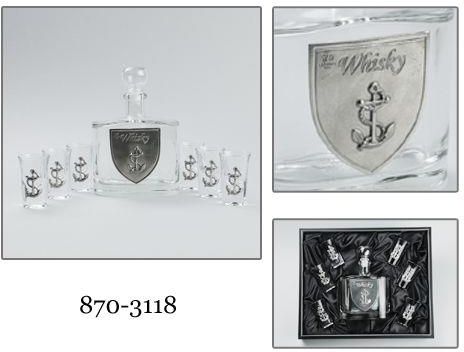 Na prezent... szklany komplet Freitas & Dores Unipessoal składający się z karafki 500ml oraz sześciu kieliszków 30ml ze zdobieniami(kotwiczki, na karafce tarcza z kotwiczką oraz napisem Whisky) na szkle wykonanymi cyną. Freitas & Dores Unipessoal, Lda jest portugalską firmą założoną w 1983 roku i specjalizującą się w produkcji artykułów do dekoracji wnętrz z dodatkiem i zdobieniami z cyny, zlokalizowaną w Maia, znajdującym się nieopodal Porto. Wszystkie produkty wykonane są w 95% z czystej cyny i w 5% z miedzi i antymonu oraz zgodnie z regułą europejską - EN 611. Produkty Freitas & Dores cechuje ekskluzywność i kreatywność, a każdy przedmiot jest efektem skrupulatnej pracy i całkowitego poświęcenia 20 osób/rzemieślników firmy specjalizujących się w tworzeniu oraz dekorowaniu przedmiotów cyną, ale przy pomocy znanych i cenionych portugalskich projektantów.