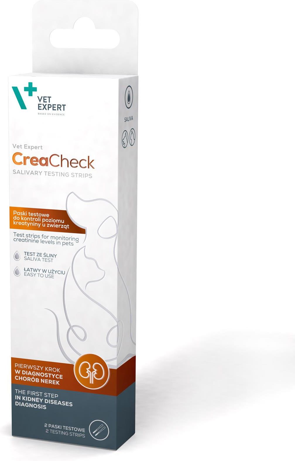 Vet Expert CreaCheck Salivary Creatinine Testing Salivary Testing Strips to rewolucyjny krok w domowej diagnostyce nerek Twojego Pupila! Skorzystaj z pierwszego na rynku testu przeznaczonego do pomiaru stężenia kreatyniny w ślinie zwierząt domowych (psów i kotów) i kontroluj zdrowie nerek pupila w prosty i bezinwazyjny sposób! Kreatynina to kluczowy wskaźnik funkcji nerek. Dzięki unikalnej formule Vet Expert CreaCheck, która pozwala na analizę śliny, badanie staje się nieinwazyjne i bezbolesne, znacząco redukując stres u Twojego czworonoga w porównaniu do tradycyjnych badań krwi. Stężenie kreatyniny w ślinie dobrze odzwierciedla jej poziom we krwi, co czyni nasz test pierwszym, szybkim i łatwym badaniem w przesiewowej diagnostyce chorób nerek. Regularne monitorowanie poziomu kreatyniny pozwala na wczesne wykrycie potencjalnych problemów, co jest kluczowe dla skutecznego leczenia i zapewnienia długiego, zdrowego życia Twojemu pupilowi. Główne korzyści testu Vet Expert CreaCheck: Pierwszy na rynku test ze śliny: Unikalna metoda pomiaru stężenia kreatyniny dająca wynik w formie półilościowej. Bezbolesne badanie: Prosty i nieinwazyjny test znacznie ogranicza stres związany z badaniem u zwierząt. Łatwy i szybki w użyciu: Forma testu umożliwia wykonanie badania samodzielnie przez opiekuna w domowym zaciszu. Wczesny wskaźnik zdrowia nerek: Badanie przesiewowe wykonywane zaledwie w 3 minuty jest pierwszym krokiem w ocenie funkcji nerek. Wsparcie w monitorowaniu: Idealny do regularnej kontroli stanu zdrowia pupila przy stwierdzonych chorobach nerek, a także u zwierząt ze skłonnościami do nich (np. rasy predysponowane, seniorzy). Pamiętaj, że Vet Expert CreaCheck to test przesiewowy i nie zastępuje wizyty u lekarza weterynarii. W przypadku niepokojących wyników, zawsze skonsultuj się ze specjalistą. Aby odczytać wynik porównaj barwę paska testowego z kartą kolorystyczną.