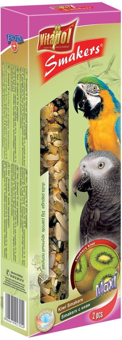 VITAPOL Smakers kiwi dla dużych papug 450g Każdy zwierzak - od największego bernardyna po drobną papużkę - ma czasem ochotę na pyszny smakołyk spoza codziennego menu. Podawanie pupilom przekąsek stanowi nie tylko zaspokojenie ich pragnień. Zdrowy przysmak jest przede wszystkim doskonałym sposobem na urozmaicenie menu Twojego zwierzątka. Smakers MAXI dla dużych papug jest idealną przekąską dla postawnych pięknych ptaków, ponieważ kawałki, z których się składa, są dostosowane do papuzich dziobów. Skład oparty na suszonych owocach i nasionach dostarczy Twojemu pierzastemu milusińskiemu witamin i minerałów, które korzystnie wpłyną na kondycję ptaka. W 80% przygotowywany ręcznie i naturalny smakers powinien znaleźć się w klatce Twojego zwierzaka już dziś! Smak: Kiwi Skład nasiona słonecznika paskowane, nasiona słonecznika białe, nasiona dyni łuskane, kiwi suszone, nasiona słonecznika czarnego, mąka z ziarna pszenicy, sorgo czerwone, sorgo białe, nasiona konopi, nasiona krokoszu barwierskiego, drożdże; barwniki. Podawać jako karmę uzupełnijącą codzienną dietę. Waga: 450 g Smakers MAXI dla dużych papug jest dostępny aż w sześciu różnych smakach: smakers MAXI pistacjowy → wysoka zawartość błonnika poprawiającego trawienie; smakers MAXI migdałowy → bogactwo magnezu i obniżenie poziomu złego cholesterolu; smakers MAXI kiwi → witamina C podnosząca odporność; smakers MAXI pomarańczowy → flawonoidy mające działanie przeciwzapalne i przeciwbakteryjne; smakers MAXI owocowy → bogactwo owoców zawierających pektyny; smakers MAXI orzechowo-kokosowy → witamina E działająca ochronnie na układ nerwowy i układ odpornościowy. Skład smakersa MAXI dla dużych papug pistacjowego: nasiona słonecznika białe, nasiona słonecznika paskowane, pistacje łuskane, nasiona konopi, sorgo czerwone, sorgo białe, nasiona krokoszu barwierskiego, nasiona dyni łuskane, mąka pszenna. Skład smakersa MAXI dla dużych papug migdałowego: migdał, nasiona słonecznika, sorgo białe, wiórki kokosowe, mąka pszenna, nasiona krokoszu barwierskiego, nasiona konopi, sorgo czerwone. Skład smakersa MAXI dla dużych papug pomarańczowego: nasiona słonecznika paskowane, nasiona słonecznika białe, ananas, sorgo czerwone, sorgo białe, skórka pomarańczowa, nasiona konopi, mąka z ziarna pszenicy, nasiona krokoszu barwierskiego, drożdże; barwinki. Skład smakersa MAXI dla dużych papug owocowego: ananas, nasiona słonecznika paskowanego, nasiona słonecznika białego, nasiona krokoszu barwierskiego, wiśnia suszona, żurawina, sorgo czerwone, jabłko suszone, banan, sorgo białe, morela suszona, kiwi suszone, nasiona konopi, porzeczka czerwona, skórka pomarańczowa, mąka z ziarna pszenicy. Skład smakersa MAXI dla dużych papug orzech-kokos: nasiona słonecznika paskowanego, orzech ziemny obłuszczony, nasiona słonecznika białego, ananas, kokos, nasiona krokoszu barwierskiego, banan, sorgo czerwone, sorgo białe, nasiona konopi, mąka z ziarna pszenicy.