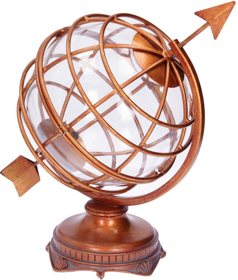 Oryginalna dekoracja - globus. Wykonana z metalu w miedzianym kolorze oraz przezroczystego szkła. Będzie stylową ozdobą gabinetu lub biura. Szczególnie przypadnie do gustu podróżnikom. Wymiary: szer. 32cm, gł. 23cm, wys. 34,5cm. Materiał: metal. Kolor: miedziany. Waga: 2,85kg.