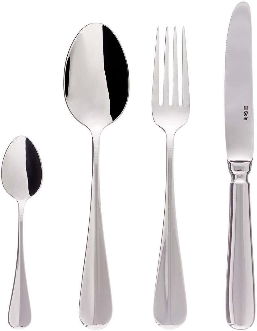 Sztućce Prince komplet dla 6 osób 24 części, 44 x 33 x 5 cm Kod produktu: 814-742 Komplet sztućców wykonanych ze stali nierdzewnej w kolorze srebrnym. Klasyczne piękno i nowoczesny design zaklęte w zestawie sztućców, składającym się z 24 części. Klasyczna forma oraz lekko zaokrąglona rękojeść bez zdobień, doskonale sprawdzą się podczas serwowania posiłków. Ich uniwersalny charakter sprawia, że wyjątkowo komponują się z zastawą stołową w każdym stylu. Sztućce Prince są idealne w codziennym użytkowaniu oraz w trakcie rodzinnych uroczystości, jako praktyczne i eleganckie uzupełnienie stołowej zastawy. Zapakowane w ozdobne pudełko są ciekawą propozycją na wyjątkowy prezent okolicznościowy, np. ślubny. Produkt wykonany ze stali nierdzewnej Sztućce można myć w zmywarce. Komplet zawiera: 6 łyżek, 6 łyżeczek, 6 widelców, 6 noży. Materiał: stal nierdzewna. Wykończenie: błyszczące. Kolor: srebrny. Dane produktu Waga: 2.30kg Rozmiar: 44 x 33 x 5 cm