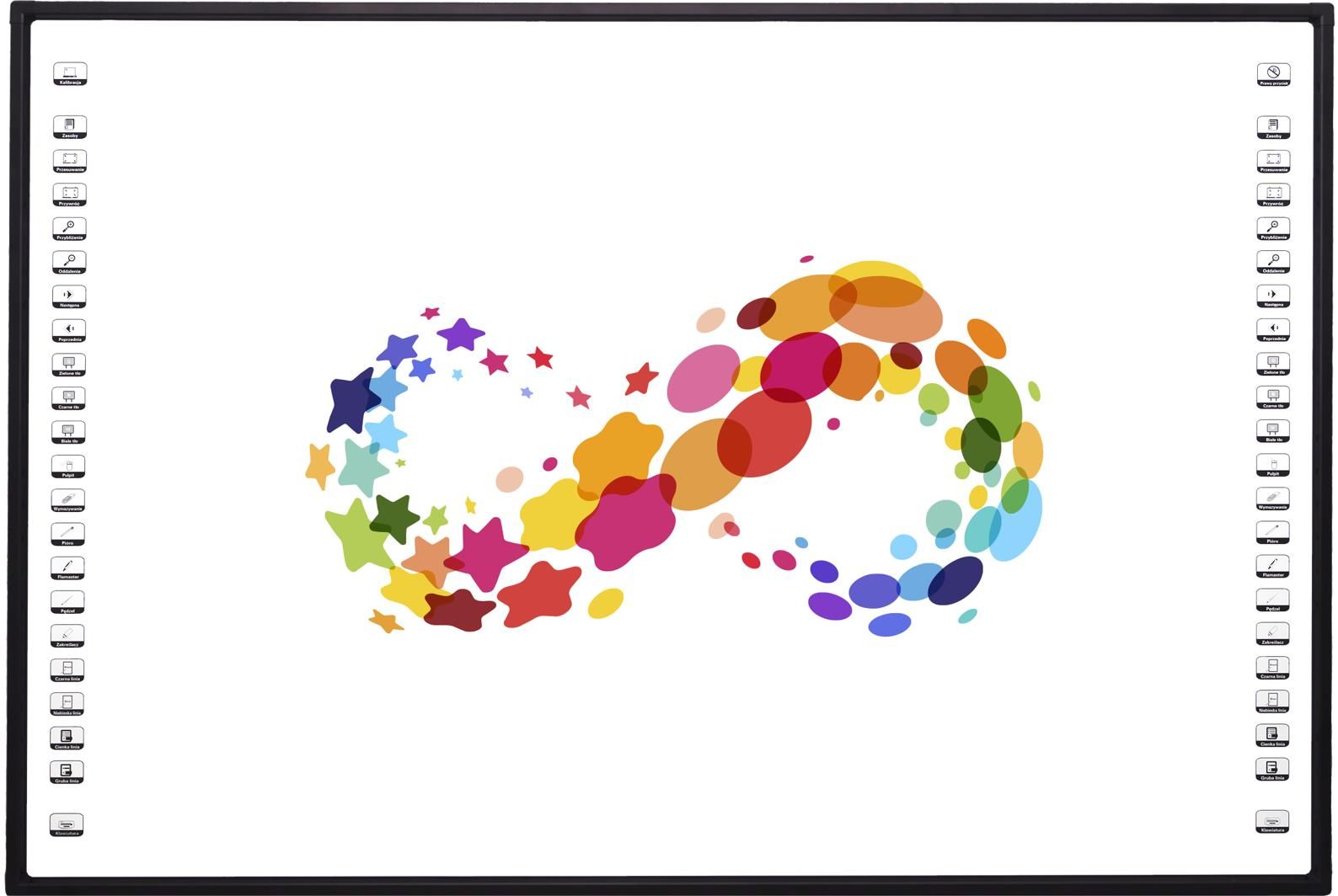 Tablica interaktywna iBoard 85 slim Tablica iBoard SLIM wykorzystuje technologię pozycjonowania w podczerwieni. Do pracy na niej można posłużyć się dowolnym przedmiotem, również palcem. Dzięki 10 punktowemu wielodotykowi możliwe jest wykonywanie gestów takich jak obracanie, powiększanie czy zmniejszanie obiektów. Powierzchnia tablicy została zoptymalizowana pod kątem wyświetlania obrazu z projektora oraz pisania pisakami do tablic suchościeralnych. Możliwe jest także używanie na niej magnesów. Tablica iBoard SLIM jest wyposażona w tzw. interfejs HID. Do prawidłowej pracy nie jest wymagane instalowanie jakichkolwiek sterowników, wystarczy podłączyć tablicę do portu USB w komputerze. Idealne rozwiązanie dla biznesu i edukacji iBoard to rodzina tablic interaktywnych wykorzystujących technologię pozycjonowania w podczerwieni, umożliwiającą dotykową obsługę przy jednoczesnym zachowaniu 100% odporności powierzchni na uszkodzenia mechaniczne. Dzięki temu rozwiązanie to idealnie sprawdza się zarówno w szkolnictwie jak i sektorze biznesowym. Solidna konstrukcja Unikalną cechą tablic iBoard jest magnetyczna, lakierowana powierzchnia, suchościeralna. Taka konstrukcja gwarantuje wysoką odporność powierzchni na wszelkiego rodzaju zarysowania. Komfort, duża łatwość obsługi Do pracy na tablicy iBoard można posłużyć się własnym palcem lub jednym z magnetycznych "pisaków" umieszczonych na specjalnej, inteligentnej ramie, umożliwiającej zmianę koloru pisania i funkcji wymazywania. Dzięki temu rozwiązaniu tablica nie ma żadnych wystających elementów, a nauczyciel chcąc skorzystać z pisaka nie musi się po niego schylać do półki. Wszechstronność zastosowania Po obu stronach tablicy umieszczone zostały czytelne, kolorowe paski skrótów do najczęściej wykorzystywanych funkcji oprogramowania. Paski te mogą być wyłączone i usunięte z powierzchni dzięki czemu tablice iBoard mogą być wykorzystane np. w muzeach oraz jako tablice informacyjne. Unikalne cechy oprogramowania iBoard Format 4:3 Przekątna powierzchni roboczej: 81.4" Technologia pozycjonowania w podczerwieni 10-punktowy wielodotyk Powierzchnia magnetyczna lakierowana pozwalająca wyświetlać obraz jak i pisać "zwykłymi" pisakami suchościeralnymi Wąska rama umożliwiająca uzyskanie większej powierzchni roboczej przy takich samych wymiarach zewnętrznych Inteligentna półka na pisaki Interfejs HID, umożliwiający pracę tablicy bez instalowania sterowników Przycisk kalibracji dostępny w pasku skrótów na tablicy Możliwość umieszczenia własnych skrótów do zewnętrznych programów w menu Praca na warstwach graficznych, blokowanie poszczególnych warstw, grupowanie elementów, definiowanie przeźroczystości Lupa – umożliwia powiększenie wybranego fragmentu grafiki lub tekstu Reflektor – skupia uwagę słuchaczy na wybranym fragmencie prezentacji Kurtyna – opcja pozwalająca na odkrywanie tylko istotnej dla nas w danym momencie części prezentowanej treści Narzędzia do geometrii – cyrkiel, linijka, ekierka, kątomierz Rozpoznawanie pojedynczych liter (również polskich) oraz wyrazów napisanych odręcznie i przekształcenie ich na czcionkę komputerową Inteligentny długopis: automatyczne rozpoznawanie odręcznie narysowanych figur geometrycznych Możliwość wstawiania figur geometrycznych Kamera ekranu rejestrująca Wszystkie czynności wykonywane na tablicy tzn. pisanie, zaznaczanie, rysowanie, wstawianie zdjęć itd. i zapisująca je w formacie filmu avi Możliwość wykorzystania dołączonej galerii zdjęć i zasobów przydatnych podczas lekcji, np. gotowych scenariuszy, animacji flash itd.