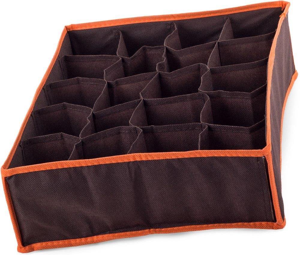 Organizer na bieliznę idealnie nadaje się do wszelkiego rodzaju szuflad lub na dnie szafy. Posiada 20 przegródek dzięki czemu pozwala na zachowanie porządku w szufladach z bielizną. Przenośny pojemnik pozwoli w prosty i praktyczny sposób na uporządkowanie bielizny, skarpetek, krawatów czy pasków chr(13) Organizer na bieliznę idealnie nadaje się do wszelkiego rodzaju szuflad lub na dnie szafy. Posiada 20 przegródek dzięki czemu pozwala na zachowanie porządku w szufladach z bielizną. Przenośny pojemnik pozwoli w prosty i praktyczny sposób na uporządkowanie bielizny, skarpetek, krawatów czy pasków bezładnie umieszczonych w szufladach. Posiada elementy usztywniające boki, dzięki czemu posiada stabilną konstrukcję. Po złożeniu zajmuje mało miejsca, co sprawia że można go zabrać w podróż, na urlop lub na wczasy. SPECYFIKACJA TECHNICZNA Kod produktu: 01621_BR Wykonany z materiału przepuszczającego powietrze Łatwy w czyszczeniu Boki organizera dodatkowo usztywnione tekturą Posiada 20 przegródek Wymiary przegródek: 7cm x 7,5cm Głębokość: 10cm Wymiary organizera: 35cm x 28cm x 10cm Wymiary po złożeniu: 35cm x 11,5cm x 1,5cm Kolor: brązowy ZESTAW ZAWIERA Fabrycznie nowy organizer z 20 przegródkami Oryginalne opakowanie