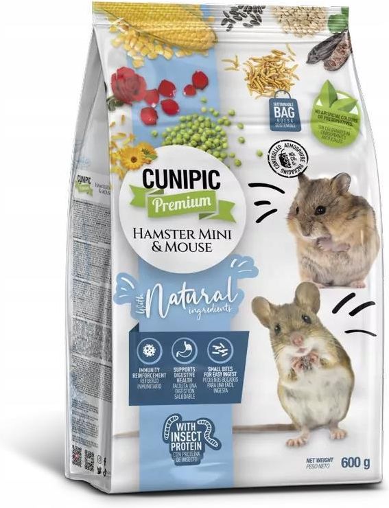 CUNIPIC Premium Hamster mini Mouse 600g karma dla chomików mini i myszy CUNIPIC Premium Hamster mini Mouse to kompletna i zbilansowana karma opracowana specjalnie z myślą o zaspokojeniu potrzeb żywieniowych chomików i myszy. Ta wszystkożerna dieta zawiera larwy robaków, które stanowią dodatkowe źródło wysokiej jakości białka i innych składników odżywczych ważnych dla zdrowia tych zwierząt. Jedną z głównych zalet tej karmy jest to, że pomaga ona wzmocnić układ odpornościowy Twojego zwierzaka, co pomaga zapobiegać chorobom i zaburzeniom. Dodatkowo został opracowany tak, aby promować zdrowe trawienie i zapobiegać powszechnym problemom żołądkowo-jelitowym u chomików i myszy. Małe kawałki do żucia ułatwiają połykanie, a zbilansowana mieszanka błonnika wspomaga prawidłową pracę jelit i pomaga zapobiegać otyłości. Dodatkowo ta żywność pomaga zachować jedwabiste i lśniące włosy, co jest ogólną oznaką dobrego zdrowia. Pamiętaj również, że ta karma pomaga utrzymać zęby Twojego zwierzaka w prawidłowym stanie. Zawiera składniki odżywcze, które pomagają utrzymać zęby w czystości i mocne, co jest niezbędne dla chomików i myszy, których zęby stale rosną. Wreszcie, produkt ten nie zawiera sztucznych barwników ani konserwantów, co czyni go zdrowszym i bezpieczniejszym sposobem karmienia Twojego zwierzaka. Krótko mówiąc, Cunipic Premium Mini Chomiki i Myszy to kompletna i zbilansowana dieta, która znacząco poprawi zdrowie i samopoczucie Twojego zwierzaka. Skład: groch* (20.70 %), kukurydza* (non-GMO) (20.16 %), nasiona słonecznika, otręby pszenne (10.50 %), ryż ekstrudowany, jęczmień ekstrudowany, owies ekstrudowany, marchew* (6 %), szarańczyn strąkowy*, fasola* (2.50 %), pszenica*, płatki grochu z dodatkiem kwasu askorbinowego (źródło witaminy C), jeżówka (Echinacea), nasiona dynii*, nagietek* (Calendula officinalis L.), drożdże piwne (2.3 %), jęczmień*, melasa, olej sojowy, owies*, larwy robaków* (Tenebrio molitor, 1.4%), węglan wapnia, sól morska, czosnek*, oregano*, juka i fosforan monowapniowy. *Naturalne składniki Składniki analityczne: Białko 15.75 %, Błonnik 7.31 %, Popiół surowy 4.58 %, Tłuszcz 4.22 %, Wilgotność 13.70 %; Wapń 0.53 %, Fosfor 0.46 %, Sód 0.17 %. Wartości odżywcze na 1 kg: Witamina A (3a3672a) 13350 IU, Witamina D3 (3a671) 1155.00 IU; Witamina E (3a700) 47.50 mg; Żelazo (3b103) 68.00 mg; Jod (3b202) 7.62 mg; Kobalt (3b304) 0.45 mg, Miedź (3b405) 23.00 mg, Mangan (3b502) 42.00 mg, Cynk (3b603) 71.00 mg, Selen (3b801) 0.26 mg, L -lizyna (3c321) 0.10 %, DL-Metionina (3c301) 0.22 %, L-Treonina (3c410) 0.08 %, kwas linolowy (C18:2) 1.34 %, kwas linolowy (C18:3) 0.18 %; przeciwutleniacze. Wskazówki użycia:Podawać zalecaną dzienną dawkę. Dietę urozmaicać różnymi sianami Cunipic. Upewnij się, że zwierzak ma zawsze czystą i świeżą wodę. Przechowywać w chłodnym, suchym miejscu.
