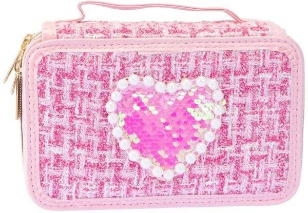 Piórnik tweedowy 3 poziomy jasny róż Stylowy piórnik Girabrilla wykonany jest z modnej tweedowej tkaniny, to doskonały wybór dla każdej dziewczynki, która lubi łączyć modę z praktycznością. Perłowe zdobienia i połyskujące serduszko nadają mu wyjątkowego charakteru. Piórnik posiada 3 pojemne …