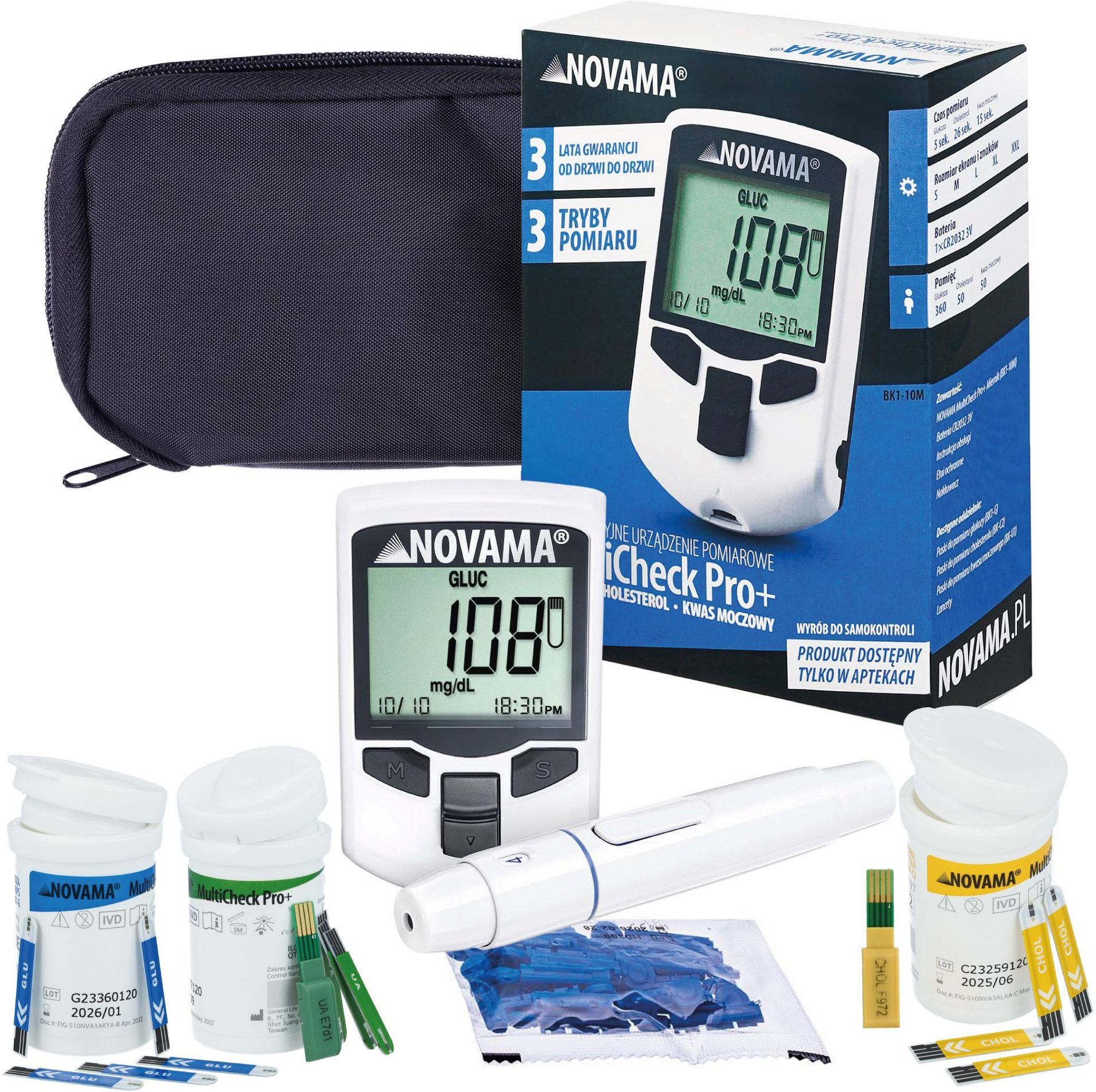 Urządzenie Novama MuliCheck Pro+ Instrukcja obsługi Etui ochronne Nakłuwacz 25 sztuk Paski do pomiaru cholesterolu: 5 sztuk, plus chip kodujący ustawienie na pomiar cholesterolu; Paski do pomiaru glukozy: 10 sztuk (wykonanie badania nie wymaga chipa); Paski do pomiaru kwasu moczowego: 10 sztuk, plus chip kodujący ustawienie na pomiar kwasu moczowego. Miernik wielofunkcyjny NOVAMA MULTICHECK PRO+ Nie od dziś wiadomo, że lepiej zapobiegać niż leczyć, ale jak to zrobić? Ograniczony dostęp do lekarzy specjalistów, ciągłe kolejki i ogromne koszty leczenia nie zachęcają do wizyt w jednostkach służby zdrowia. Na szczęście teraz możesz mieć najważniejsze parametry krwi pod kontrolą bez wychodzenia z domu! Regularny pomiar poziomu glukozy, cholesterolu i kwasu moczowego może ułatwić ci zahamowanie rozwoju najczęściej występujących chorób cywilizacyjnych. Badania krwi: glukoza, cholesterol i kwas moczowy. To jedne z ważniejszych parametrów, które powinny być regularnie kontrolowane u wszystkich osób po 30 roku życia. Badanie stężenia glukozy, cholesterolu i kwasu moczowego może umożliwić wczesne wykrycie najczęściej występujących chorób takich jak cukrzyca, choroby układu krążenia czy dny moczanowej. Multicheck Pro+ w twoim domu to gwarancja stałego dostępu do podstawowych badań, które mogą w porę ostrzec przed niekorzystnymi dla zdrowia parametrami. Szybka weryfikacja poziomu glukozy, cholesterolu i kwasu moczowego daje szanse na wczesne wdrożenie odpowiedniej diety i aktywności, która nie dopuści do rozwoju najczęściej występujących chorób cywilizacyjnych. Parametry odbiegające od norm sygnalizują konieczność wizyty u lekarza specjalisty. Funkcja glukometru Pomiar zawartości glukozy w kapilarnej krwi pełnej pobranej z palca, dłoni lub przedramienia. Pamięć – 360 wyników Wyliczanie średniej z 7, 14, 21 i 28 dni Zakres pomiarowy 20-600 mg/dL (1,1–33,3 mmol/L) Multichceck PRO+ to profesjonalne urządzenie polecane dla pracowników służby zdrowia, ale także dla wszystkich osób obciążonych chorobami cywilizacyjnymi takimi jak cukrzyca, dna moczanowa, hipercholesterolemia. Polecane jest również pacjentom obciążonym genetycznie chorobami które mają związek z poniesionym poziomem glukozy, cholesterolu lub kwasu moczowego. Pomiaru cholesterolu Pomiar całkowitego poziomu cholesterolu w kapilarnej krwi pełnej pobranej z palca/ krwi żylnej/ krwi tętniczej. Zakres pomiarowy 100-400 mg/dL (2,59-10,35 mmol/L) Pamięć – 50 wyników Pomiar kwasu moczowego Pomiar całkowitego poziomu kwasu moczowego w kapilarnej krwi pełnej pobranej z palca/ krwi żylnej/ krwi tętniczej. Zakres pomiarowy 3-20 mg/dL (0,18–1,19 mmol/L) Pamięć – 50 wyników Multichcek Pro+ to wielofunkcyjny miernik wskazujący poziom glukozy, cholesterolu i kwasu moczowego. Do wykonania pomiaru urządzenie wykorzystuje metodę elektrochemicznej technologii bio-sensorycznej. Czas pomiaru to tylko 15 sekund! Wbudowany wyrzutnik pasków - gwarancja bezpieczeństwa i higieny! Wielofunkcyjny miernik MulitiCheck Pro+ ma wbudowany wyrzutnik pasków, który umożliwia higieniczne usunięcie paska z krwią bez konieczności jego dotykania. Po wykonaniu badania możesz usunąć pasek za pomocą jednego przycisku. Takie rozwiązanie gwarantuje bezpieczeństwo i higienę użytkowania zgodnie z obowiązującymi przepisami sanitarnymi. Oprócz tego, że wielofunkcyjny miernik MultiCheck Pro+ umożliwia dokonanie precyzyjnych badań w zaciszu swojego domu to dodatkowo jest bardzo proste w obsłudze. Intuicyjna obsługa i przejrzysty ekran to cechy, które na pewno docenią seniorzy. Prosta konstrukcja i tylko trzy przyciski. Szybki pomiar bez wychodzenia z domu, bez kolejek w przychodni i wizyt u lekarza po skierowanie na badania. Łatwe badanie krwi dla seniorów! Funkcja Auto Strip Recognition czyli funkcja automatycznego rozpoznawania paska. Po zakodowaniu miernika i włożeniu paska urządzenie automatycznie przełączy się na odpowiedni tryb pomiarowy. Urządzenie poinformuje o źle wprowadzonym pasku, słabej baterii czy niewystarczającej ilości próbki krwi. Do wykonania badania potrzebne będą: Urządzenie MultiCheck Pro+, paski testowe, nakłuwacz, lancety, chusteczka lub wacik nasączone płynem odkażającym miejsce pobierania próbki. Zdrowie pod stałą kontrolą! Gwarancja 36 miesięcy! Wielofunkcyjny miernik MultiCheck Pro+ to gwarancja stałego dostępu do serwisu reklamacyjnego "Od drzwi do drzwi". Gdy tylko pojawi się problem z urządzeniem możesz zadzwonić na infolinię gdzie eksperci pomogą znaleźć rozwiązanie lub wyślą kuriera po twój miernik by dokonać bezpłatnej naprawy lub wymiany. W skład zestawu wchodzą: Urządzenie Novama MuliCheck Pro+; Instrukcja obsługi; Etui ochronne; Nakłuwacz i 25 lancetów Paski do pomiarów, lancety i roztwory kontrolne są do nabycia oddzielnie.