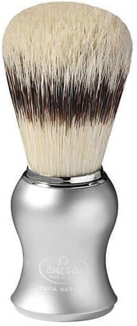Pędzel do golenia z czystego włosia Omega - efekt borsuka - z satynowaną plastikową rączką. Cechy: Opakowanie: pojedynczy pędzel do golenia Węzeł: efekt włosia borsuka Uchwyt: tworzywo sztuczne Rozmiar: 106 Kolor: szary