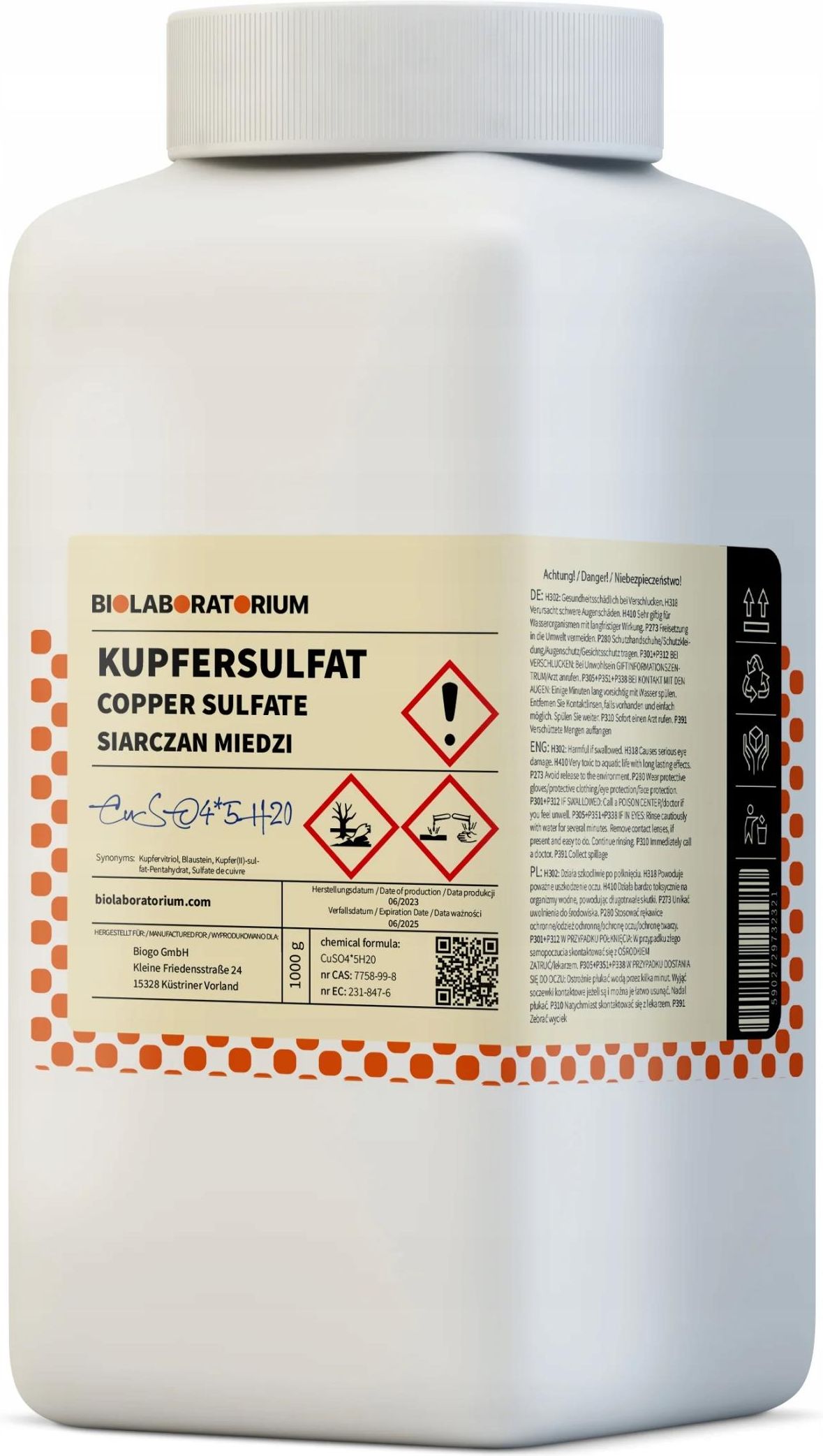 Siarczan miedzi. Miedź pentahydrat 1kg Biolaboratorium Siarczan miedzi. Miedź pentahydrat 1kg Biolaboratorium Informacje techniczne na temat odczynników chemicznych Wzór chemiczny: CuSO₄ x 5H₂O Numer CAS: 7758-99-8 Numer WE: 231-847-6 Synonimy: miedź pentahydrat Gatunek: Czysty Czystość: czystość min. 93% Masa netto: 1 kg Przykłady zastosowań profesjonalnych w różnych branżach Rolnictwo: Fungicydy i herbicydy: Stosowane do zwalczania chorób grzybowych, takich jak mączniak i rdza, na winorośli, drzewach owocowych i warzywach. Uzdatnianie wody: Kontrola glonów: Stosowany w celu kontroli glonów w zbiornikach wody pitnej, basenach i systemach nawadniających. Branża budowlana: Środki konserwujące drewno: chronią drewno przed gniciem, atakiem grzybów i owadów, wydłużając w ten sposób żywotność produktów drewnianych. Przemysł chemiczny: Produkcja chemikaliów: Służy jako materiał wyjściowy do produkcji różnych związków miedzi i innych chemikaliów, a także do produkcji katalizatorów miedzianych i pigmentów. Przemysł elektryczny: Galwanizacja: Stosowana do cynkowania metali, służy jako elektrolit w procesach miedziowania. Przemysł tekstylny: Barwienie i drukowanie tekstyliów: Stosowany jako zaprawa w barwieniu i drukowaniu tekstyliów, poprawia przyczepność barwników do włókien. Ostrzeżenia o zagrożeniach na etykiecie produktu H302: Działa szkodliwie po połknięciu. H315: Działa drażniąco na skórę. < >H319: Działa drażniąco na oczy. H410: Działa bardzo toksycznie na organizmy wodne, powodując długotrwałe skutki.< br>P273: Unikać przedostania się do środowiska. P305 + P351 + P338: W PRZYPADKU DOSTANIA SIĘ DO OCZU: Ostrożnie płukać dużą ilością wody. Spłukać wodą. Jeżeli to możliwe, wyjmij istniejące soczewki kontaktowe. Kontynuuj płukanie. P501: Zawartość/pojemnik usuwać do zatwierdzonego zakładu utylizacji odpadów. Zalecane warunki przechowywania Pięciowodny siarczan miedzi(II) należy przechowywać w suchym i chłodnym miejscu, z dala od źródeł ciepła i ognia. Produkt należy przechowywać w dobrze wentylowanym miejscu, z dala od innych substancji chemicznych oraz w miejscu niedostępnym dla dzieci i zwierząt. Podczas obchodzenia się z tym produktem należy unikać kontaktu ze skórą i oczami oraz stosować odpowiedni sprzęt ochrony osobistej. Opakowanie powinno zawierać odpowiednie oznaczenia i etykiety ostrzegające przed ryzykiem i informujące o sposobie postępowania z produktem w przypadku narażenia na nie. Oznaczenia na opakowaniu Producent: Kategoria: Waga z opakowaniem: 0 kg