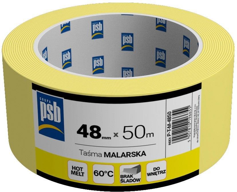 Taśma malarska żółta PSB 48mm x 50m Przedmiotem aukcji jest jedna sztuka. Niezawodna taśma malarska żółta PSB o szerokości 48 mm oraz długości 50 m, którą dostarczyła marka SILA, oferująca wyłącznie sprawdzone akcesoria malarskie w bardzo przystępnych cenach. Jest to rozwiązanie stosowane zarówno przez specjalistów świadczących usługi remontowo-budowlane, jak też osoby prywatne. Okazuje się niezbędne podczas malowania lub lakierowania różnych powierzchni - zabezpieczy je przed zabrudzeniami i pozwoli uzyskać doskonały, estetyczny efekt. Taśma malarska posiada dużą moc klejenia, świetnie przylegając do powierzchni i jest wytrzymała 5907810196655 004850