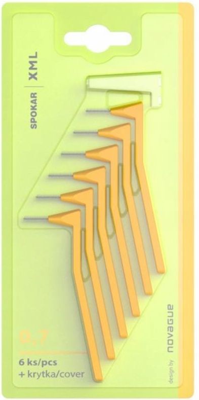 SPOKAR XML 0,7mm szczoteczki międzyzębowe 6szt. SPOKAR XML 0,7mm - szczoteczki międzyzębowe Szczoteczki międzyzębowe SPOKAR XML przeznaczone są do dokładnego czyszczenia przestrzeni międzyzębowych oraz profilaktyki chorób przyzębia. Zaprojektował je czołowy czeski projektant Petr Novague, który chciał, aby szczoteczki SPOKAR XML umożliwiały jak najłatwiejszy dostęp do tylnych przestrzeni międzyzębowych. Zestaw szczoteczek międzyzębowych SPOKAR XML zawiera 6 szczoteczek w rozmiarze 0,7mm. Szczoteczki międzyzębowe SPOKAR XML uzupełniają linię PREMIUM X artykułów do higieny jamy ustnej SPOKAR, w skład której wchodzą również szczoteczki dla dorosłych X, szczoteczki dla dzieci XD oraz szczoteczki międzyzębowe XM. Zalety szczoteczek międzyzębowych SPOKAR XML ergonomia i funkcjonalność - rękojeść o przekroju w kształcie litery "X" pozwala na wygodny chwyt i precyzyjną kontrolę nad szczotką podczas użycia, kształt „L” ułatwia dostęp do tylnych przestrzeni międzyzębowych. sztywny rdzeń o gładkiej powierzchni - szczoteczka posiada spiralę nośną wykonaną z wysokiej jakości sztywnego drutu ze stali nierdzewnej o całkowicie gładkiej powierzchni specjalne włókna - drobne włókna poliamidowe o cylindrycznym nacięciu gwarantują skuteczne, delikatne czyszczenie i długą żywotność, różnorodność rozmiarów - szczoteczki SPOKAR posiadają szeroką gamę rozmiarów, mniejsze rozmiary służą do oczyszczania powierzchni międzyzębowych, natomiast większe rozmiary są również odpowiednie do precyzyjnego czyszczenia zamków aparatów stałych, praktyczna osłonka - każde opakowanie zawiera praktyczną plastikową nasadkę, która służy do ochrony włókien i rdzenia, pozwala na higieniczne przechowywanie i przenoszenie szczoteczki. W opakowaniu znajduje się 6 szczoteczek międzyzębowych SPOKR XML w rozmiarze 0,70mm (żółte) oraz jedna nasadka na końcówkę czyszczącą. EAN: 8593534342354