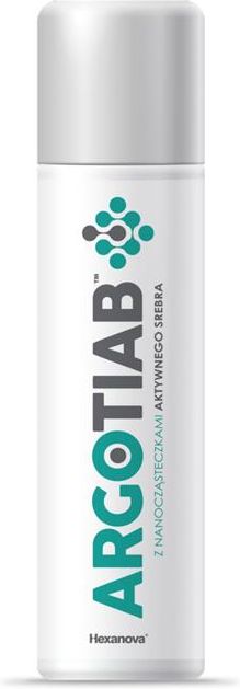 Argotiab® spray ze srebrem, 125 ml na rany, odleżyny, stopa cukrzycowa Suchy spray ze srebrem TIAB™, tworzący barierę ochronną i ograniczający macerację – szczególnie przy ranach sączących, w tym w przebiegu stopy cukrzycowej, a także przy owrzodzeniach i odleżynach. Wspiera naturalną regenerację skóry. Srebro TIAB™ wykazuje silne działanie przeciwdrobnoustrojowe, zabezpieczając gojące tkanki przed tworzeniem się flory bakteryjnej Składniki: Kompleks aktywnego srebra TIAB™ - molekuła jonów srebra związanych kowalencyjnie z mikrokryształami dwutlenku tytanu. Tworzy barierę przeciwdrobnoustrojową na skórze i wspomaga proces ochrony rany . Kaolin medyczny  – zwany również glinką białą działa jak materiał wchłaniający w przypadku ran sączących. Kaolin medyczny wykorzystywany jest w materiałach opatrunkowych inicjując procesy krzepnięcia krwi. Kwas hialuranowy  – ma właściwości hydrofilne i nawilżające ranę. Utrzymuje w tkankach wodę, znacząco skręca czas gojenia się ran, redukuje ból a także zmniejsza ryzyko powstania blizn. Kwas hialuronowy jest naturalnym składnikiem skóry ludzkiej. Argotiab suchy spray  chroni przed infekcjami, zabezpiecza przed tworzeniem flory bakteryjnej w miejscu zastosowania, tworzą korzystne warunki do ro regeneracji tkanek skóry. Wyrób medyczny  Argotiab suchy spray  należy stosować w procesie leczenia: - ran sączące i z wysiękiem, - stopie cukrzycowej, - stopie atlety (grzybicy stóp), - odleżyn, - niewielkich ran ciętych. Sposób użycia: 1. Przed nałożeniem umyć skórę i dokładnie wysuszyć, 2. Wstrząsnąć kilkanaście razy pojemnikiem przez użyciem, 3. Zaaplikować cienką warstwę suchego proszku na chore miejsce, 4. Nie masować, 5. Powtarzać czynność 2 razy dziennie.