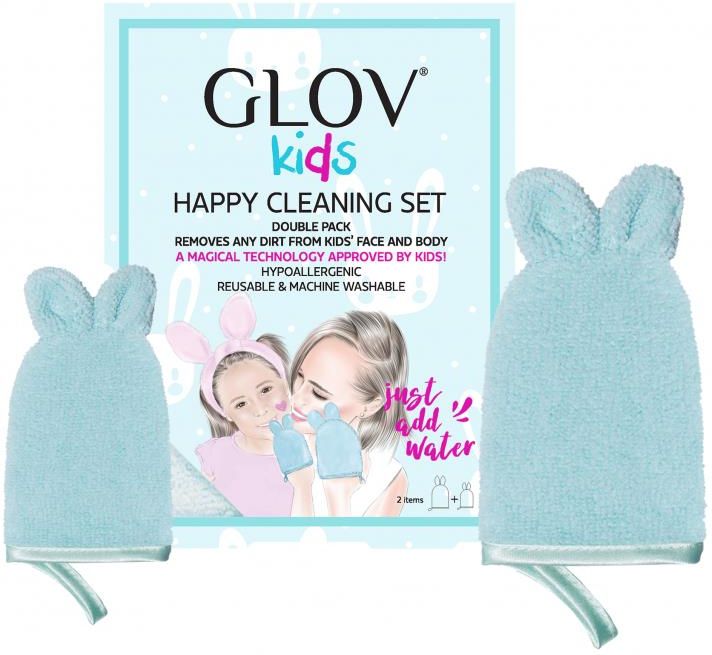 Kids - HAPPY CLAENING SET marki GLOV. Zestaw rękawic do pielęgnacji. Składa się z 2 niezwykle puszystych i uroczych ściereczek z króliczymi uszkami. Doskonale sprawdzą się do codziennego użytku dla matki i dziecka. Wykonane z hipoalergicznego, bezpiecznego dla wrażliwej skóry materiału, pomagają w utrzymaniu czystości i delikatnym demakijażu. Ponadto nie zawierają żadnych środków chemicznych, zaś do ich użycia wystarczy sama woda. Za pomocą większej rękawiczki doskonale usuniesz makijaż, zaś mniejsza posłuży dla maluszka. Dzięki uroczemu i słodkiemu wyglądowi przywodzącemu na myśl ulubionego pluszaka, zachęci najmłodszych do samodzielnego mycia się. Ponadto produkt doskonale sprawdza się przy usuwaniu plam i zabrudzeń z twarzy dziecka po posiłku. Produkt dostępny w niebieskim odcieniu.Zestaw 2 rękawic pielęgnujących.Wykonane z hipoalergicznego, delikatnego materiału.Umożliwi demakijaż i oczyszczanie skóry bez używania środków chemicznych.Uczy dziecko samodzielnego mycia się na zasadzie naśladowania.Idealna do każdego typu cery.