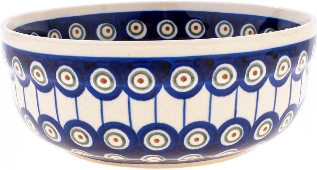 Ceramiczna miska Magnolia o średnicy 18 cm. Jest to średnia wielkość misy z tego rodzaju. Doskonała na owoce, warzywa lub na sałatki. Świetnie sprawdzi się także do przechowywania słodyczy lub innych drobiazgów. Łatwo utrzymać ją w czystości. Prezentuje się bardzo okazale, a wraz z innymi produktami tej kolekcji stanowi znakomite nakrycie stołu z charakterem. Cena dotyczy 1 szt. Pojemność użytkowa - 800 ml Pojemność producenta (po brzegi) - 1000 ml Symbol - GU-834A Dekor - 8 Kilka słów o dekoracji nr 8 - „Pawie oczka” nawiązują do tradycyjnych motywów dekoracyjnych, wśród których przeważały oczka w trzech kolorach: kobaltu, zieleni i brązu. Kółka, kreski, kremowe tło – to wszystko sprawia, że naczynia wyglądają lekko i elegancko. Naczynia ceramiczne to jedne z najstarszych rękodzieł w dziejach ludzkości. Wyroby garncarskie powstawały dla potrzeb życia codziennego, miały przede wszystkim znaczenie praktyczne i użyteczne, dlatego rzemiosło to rozwinęło się na całym świecie. Z upływem czasu ceramika zaczęła nabierać pewnych cech sztuki. Bogactwo kształtów i kolorów to tylko niektóre cechy dzisiejszych wyrobów garncarskich. Najważniejsza jest precyzja i kunszt wykonania. Wielu artystów chętnie współtowarzyszy w powstawaniu tych cudownych wyrobów. Jednym z bardziej znanych Zakładów Ceramiki w Polsce jest "Bolesławiec". Produkty, które powstają w tych zakładach są ręcznie formowane z naturalnych ekologicznych surowców. Następnie poddawane są procesowi wypalenia. W kolejnym etapie wyroby trafiają w ręce utalentowanych artystów, którzy zdobią je efektowną dekoracją podszkliwną za pomocą stempli i pędzla. Naczynia z Bolesławca należy docenić również za to, że odpowiadają ekologicznym standardom. W procesie produkcji nie stosuje się szkodliwych chemikaliów i farb, które miałyby negatywny wpływ na środowisko. Ceramika dostosowana jest do użytku w zmywarkach i kuchenkach mikrofalowych, a także posiada certyfikat do kontaktu z żywnością. Te cechy sprawiają, że bolesławieckie wyroby spełniają oczekiwania Klientów.