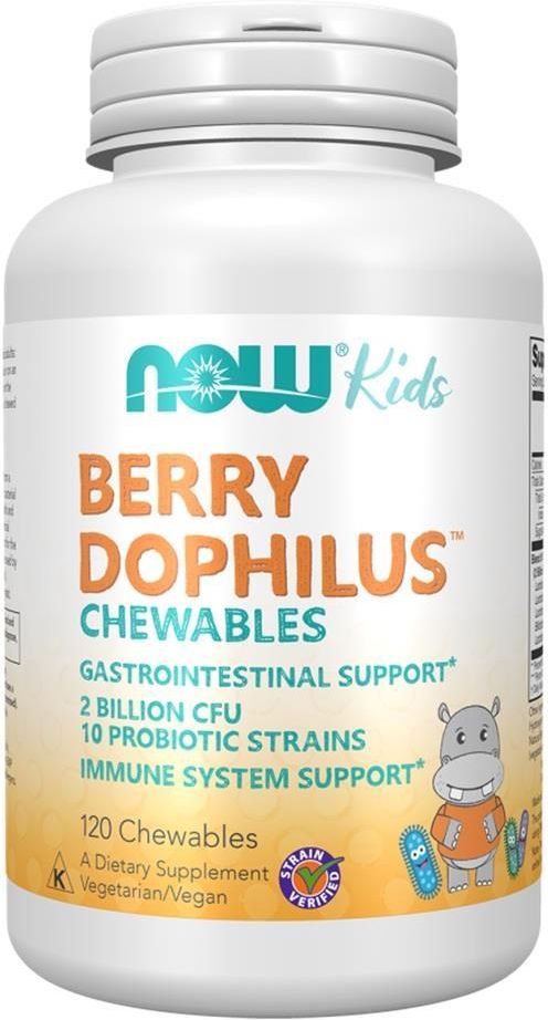 NOW Foods BerryDophilus Kids Chewables 120 tabletek do ssania suplement diety BerryDophilus NOW dostarcza 2 miliardy jednostek tworzących kolonie (CFU) z połączenia dziesięciu klinicznie sprawdzonych szczepów bakterii probiotycznych, opracowanych w celu wspierania zdrowia układu pokarmowego i …