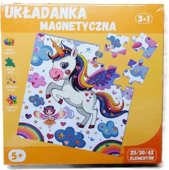 PRODUKT ORYGINALNY! ======================= PUZZLE UKŁADANKA MAGNETYCZNA 3 W 1 JEDNOROŻCE Cechy produktu: Wiek dziecka: 5+ Liczba elementów: 25/30/42 Materiał: karton O produkcie: PUZZLE UKŁADANKA MAGNETYCZNA 3 w 1 to zestaw 25/30/42 elementów wykonanych z trwałego i bezpiecznego kartonu. Dzięki magnetycznym elementom, dziecko może łatwo połączyć elementy i ułożyć trzy różne obrazki. Produkt przeznaczony jest dla dzieci powyżej 5 lat. Puzzle UKŁADANKA MAGNETYCZNA 3 w 1 to doskonały sposób na rozwijanie zdolności manualnych i kreatywności dziecka. Informacje dodatkowe: Oryginalne opakowanie jest częścią składową produktu!