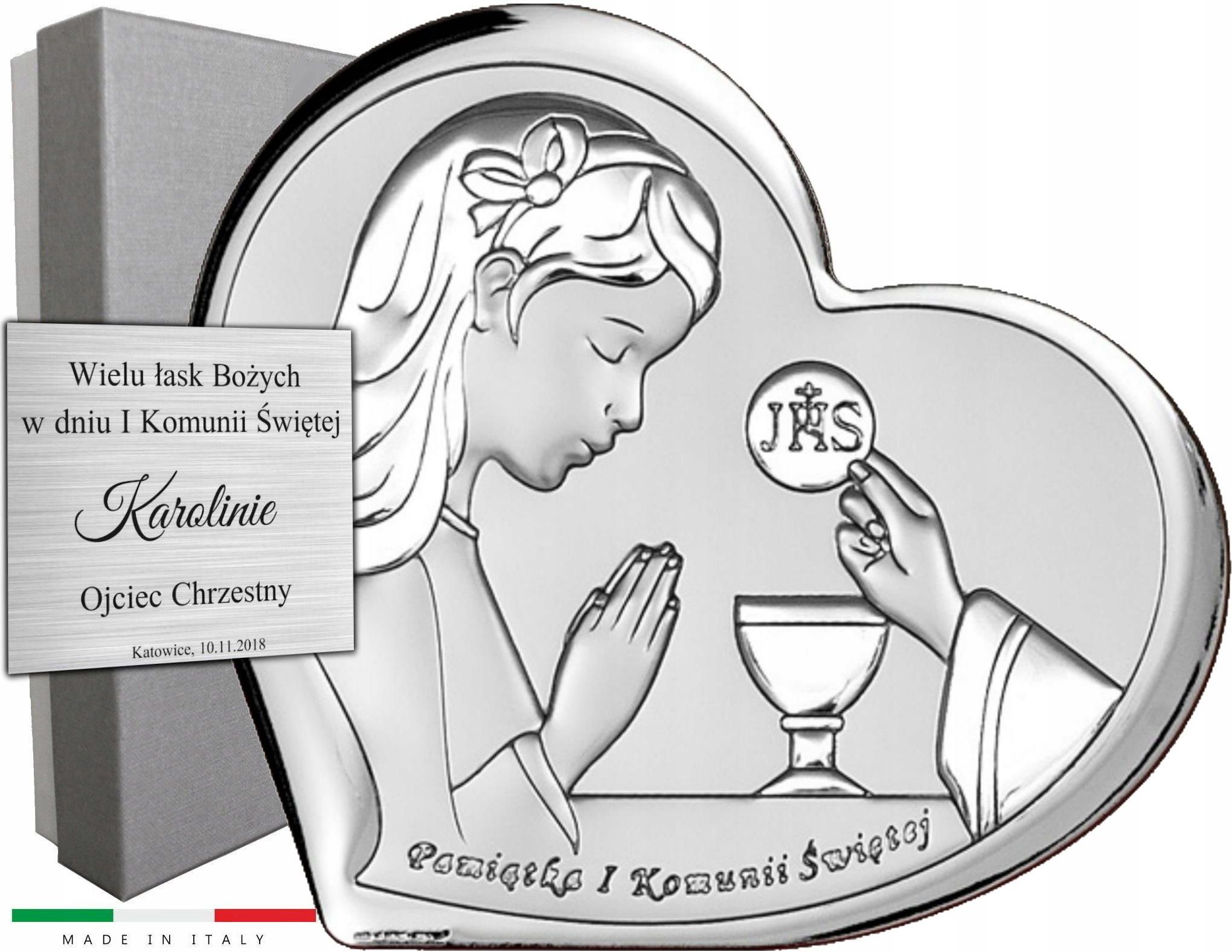 Obrazek Srebrny Pamiątka Pierwszej Komunii Świętej 8 x 7,5 cm Własna dedykacja do zamówienia - GRATIS Wymiary obrazka : Szerokość 8 cm Wysokość 7,5 cm Specyfika : Obrazek pokryty czystym srebrem pr. 999.95; Tył obrazka wykonany z wysokiej jakości drewna Możliwość postawienia: TAK Możliwość powieszenia: TAK Oryginalne opakowanie producenta : TAK Własna dedykacja : Grawer GRATIS Najwyższa jakość wykonania włoskiego producenta ! Każdy obrazek posiada CERTYFIKAT JAKOŚCI PRODUCENTA Symbol obrazka : OB-KS-6517/1A WYJĄTKOWA PAMIĄTKA Pamiątka włoskiej firmy BELTRAMI przedstawiająca wizerunek Dziewczynki przystępującej do przyjęcia sakramentu Pierwszej Komunii Świętej. Całość została zamknięta w kształcie klasycznego serca z napisem " Pamiątka I Komunii Świętej " Obrazek został osadzony na brązowym lakierowanym drewnie. Dzięki wkładanej podpórce obrazek możemy umiejscowić na komodzie lub powiesić na ścianie. NAJWYŻSZA JAKOŚĆ WYKONANIA Obrazek to połączenie dwóch szlachetnych materiałów; drewna i srebra najwyżej jakości. Do produkcji wykorzystywany jest innowacyjny metal szlachetny o nazwie MIRO-SILVER. Wierzchnia warstwa obrazka to czyste srebro próby 999,95, która dzięki specjalnej technologii jest twardsza oraz odporniejsza na śniedzenie i zarysowania w porównaniu z tradycyjnymi metodami srebrzenia. Dodatkowe zabezpieczenie w postaci specjalnego lakieru daje pewność, że obrazek będzie odbijał światło i pięknie wyglądał. Specjalna warstwa klejąca łącząca obrazek wraz z drewnem gwarantuje trwałość na wiele lat. Całość wykonania produktu potwierdza dołączony do produktu CERTYFIKAT JAKOŚCI. Wzory dedykacji z okazji I Komunii Świętej : Grawer z własną dedykacja gratis ! Dołącz do prezentu personalizowaną tabliczkę z grawerem a Twój prezent stanie się jeszcze bardziej wyjątkowy i niepowtarzalny. Dostępne są tabliczki srebrne oraz złote. JAK ZAMÓWIĆ GRAWER ? Skorzystaj z gotowych wzorów bądź napisz własną treść. Wystarczy, że podmienisz treść podkreśloną na czerwono. Dane należy wpisać w rubryce " Wiadomość do sprzedającego " Wybierz numer wzoru ( Np. KS-01 ) Zmień treść podkreśloną na czerwono Podaj kolor tabliczki ( Złota, Srebrna ) Imię, Od kogo, Data Przykład : KS-01, Srebrna, Bartusiowi, Matka Chrzestna, Kraków, 05.01.2022 Istnieje możliwość podania własnej treści dedykacji. Grawer wykonujemy techniką laserową. W największej mierze stawiamy na jakość wykonania. Dzięki wykorzystaniu nowoczesnych maszyn dedykacja jest bardzo dokładna oraz trwała. Grawer wykonywany jest na srebrnych laminowanych tabliczkach.