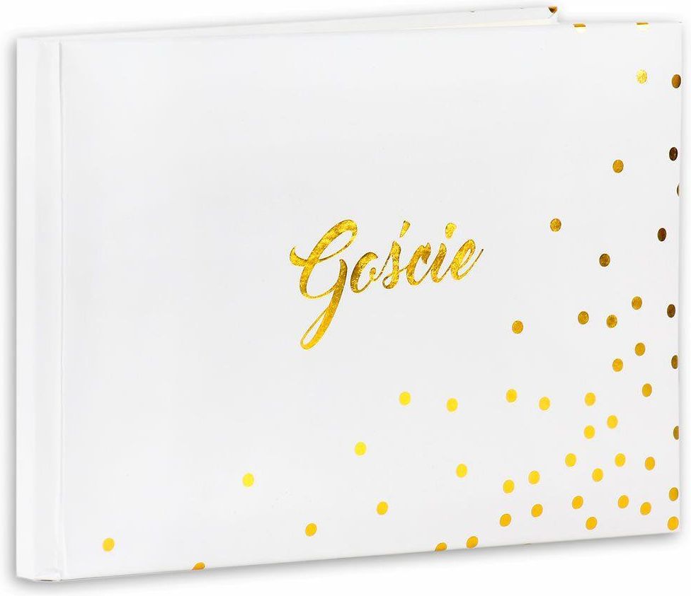 oryginalna, pamiątkowa księga gości z kolekcji ślubnej okładka ozdobiona złotym napisem „Goście” oraz nadrukiem w złote kropki wewnątrz 30 białych stron wymiary: 23x17 cm Produkt poekspozycyjny lub końcówka magazynowa. Może posiadać nieznaczne uszkodzenia opakowania (np. metki cenowe, przybrudzenia, zarysowania, zagięcia, naddarcia), które nie wpływają na funkcjonalność produktu.
